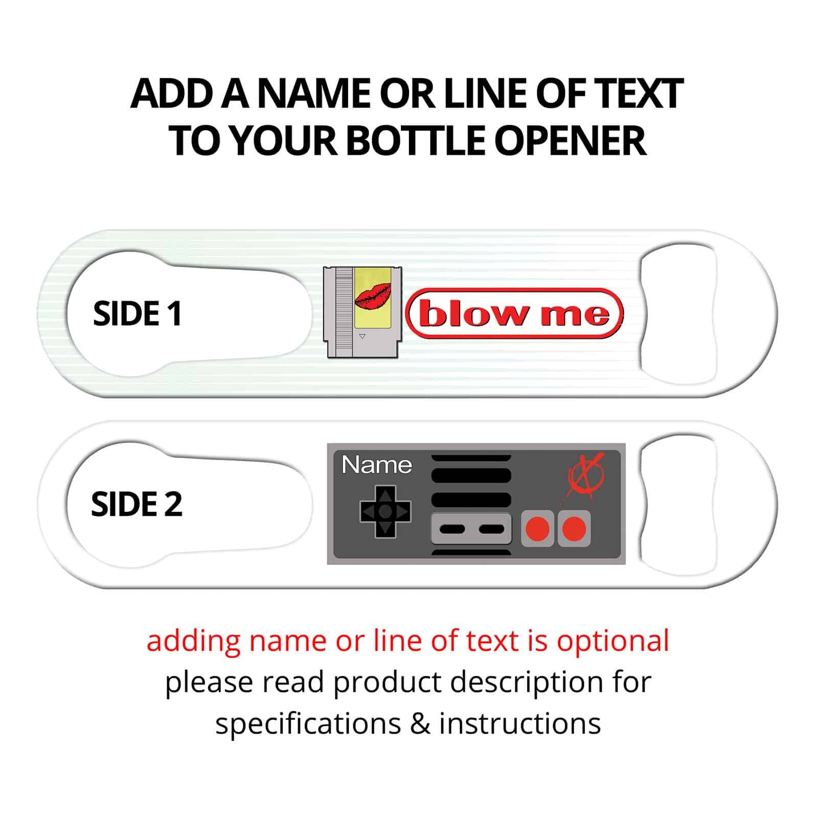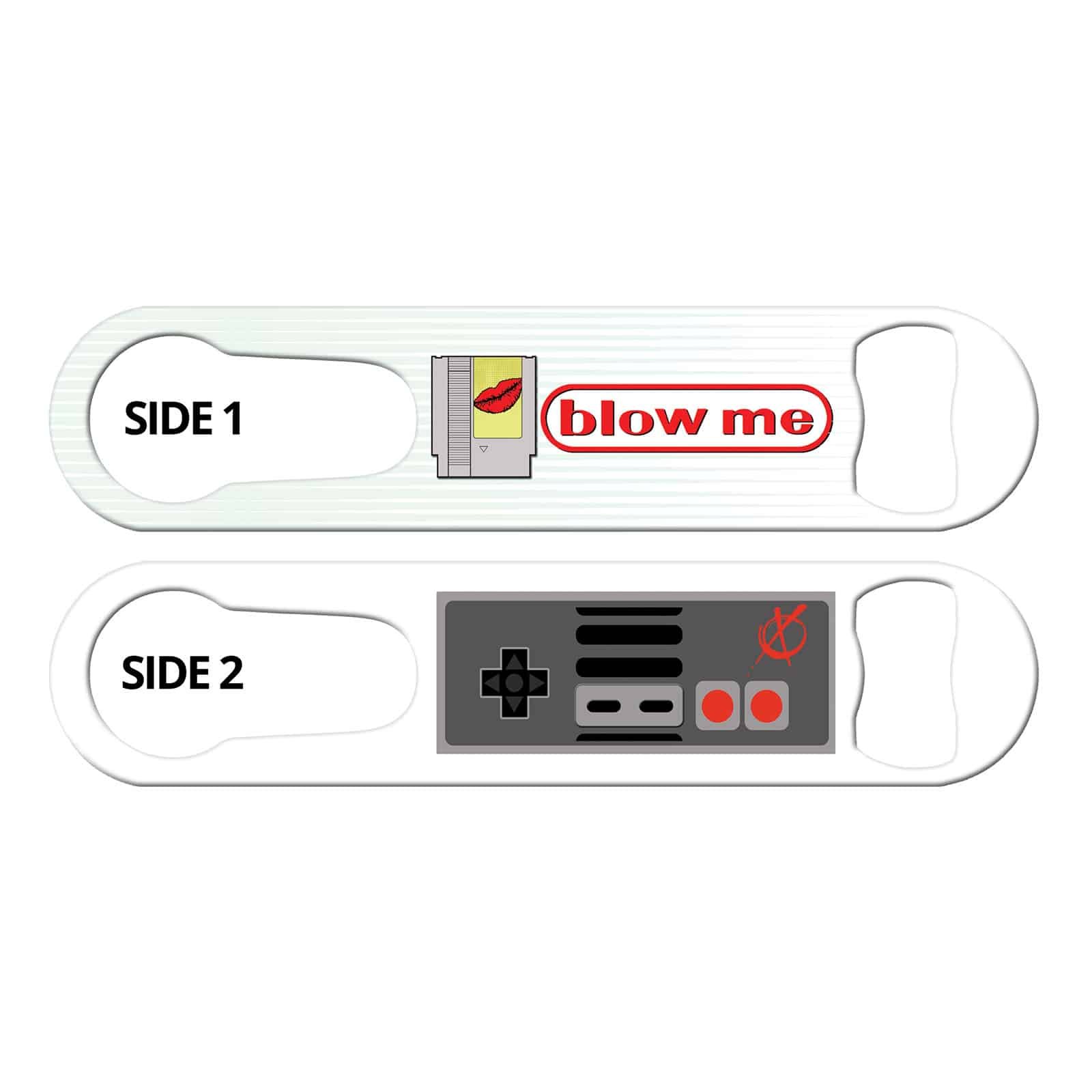 Blow Me! Cool bottle opener with convenient built-in pour spout remover. Get your geek on with this funny bottle opener featuring gamer inspired design. Practical bar tool for professional bartenders who also like to game or professional gamers who enjoy bartending!! This multi purpose bar tool also looks badass on the home bar. Personalize this church key opener by adding a name or line or text.