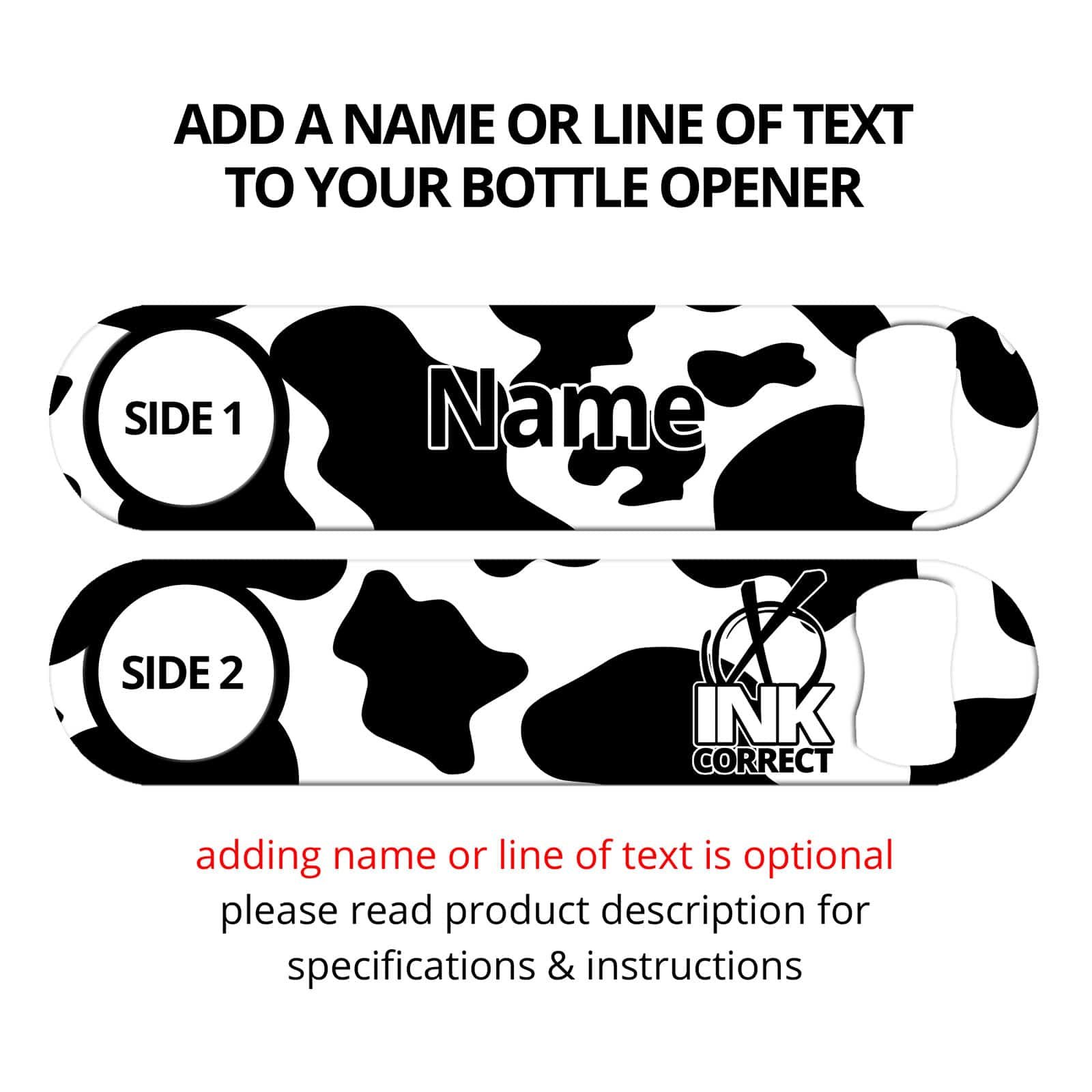 Cute bartender bottle opener featuring animal print cow skin pattern design. Cool bar tool for professional bartenders, as well as a home bar essential! Personalize your church key by adding your name.