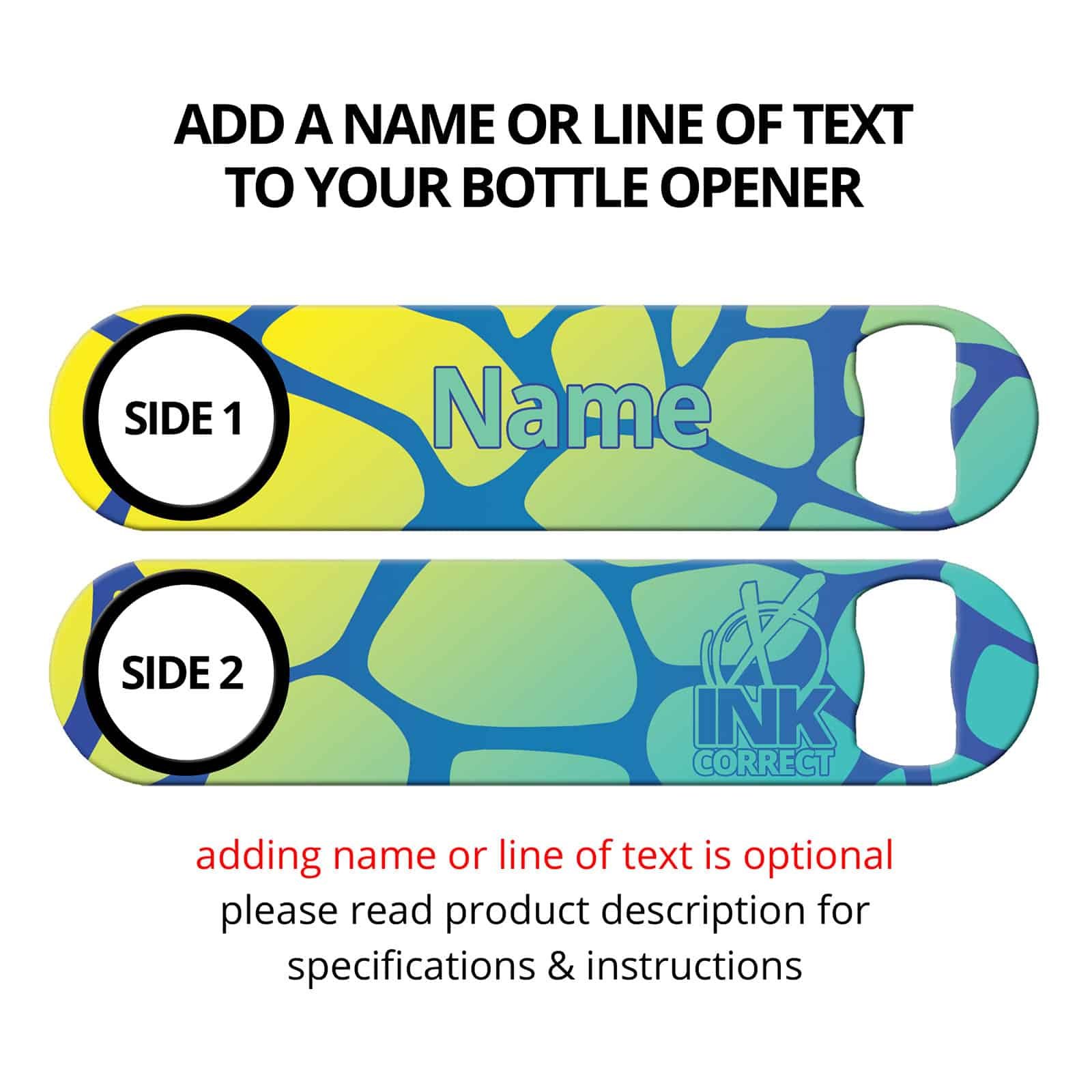 Super cute bartender speed opener featuring giraffe animal print pattern design. Unique bar tool for professional bartenders as well as the home bar! Personalize your church key by adding your name or line of text.