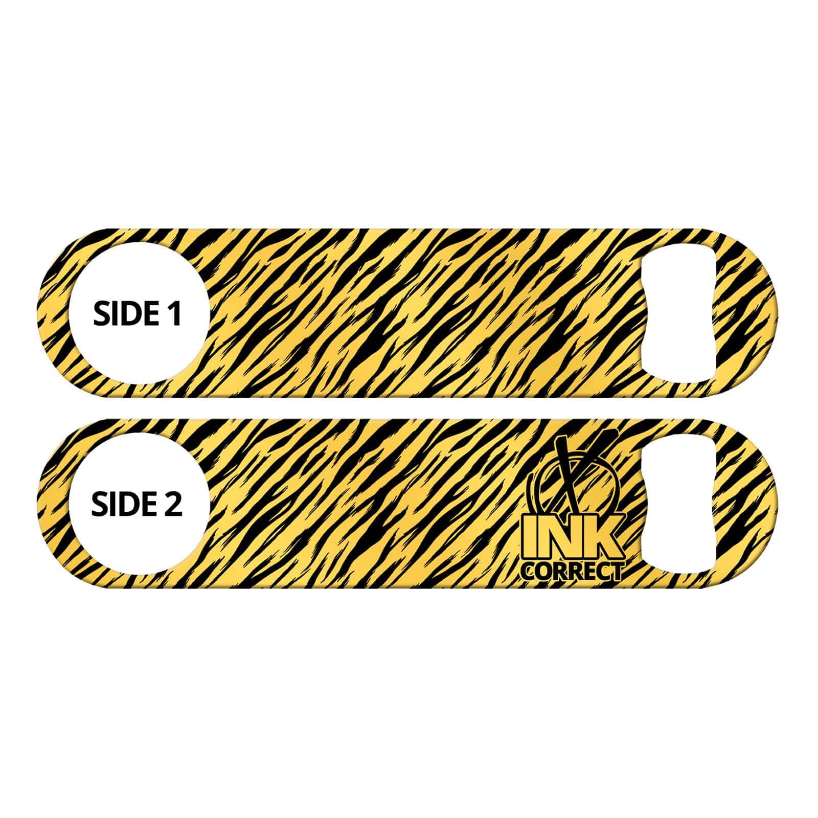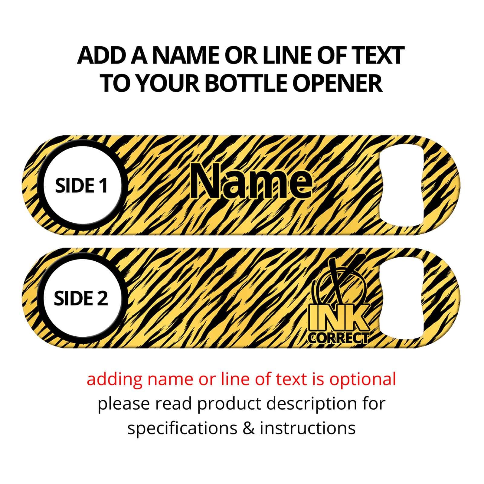 Cute bartender bottle opener featuring animal print tiger pattern design. Cool bar tool for professional bartenders, as well as a home bar essential! Personalize your church key by adding your name.