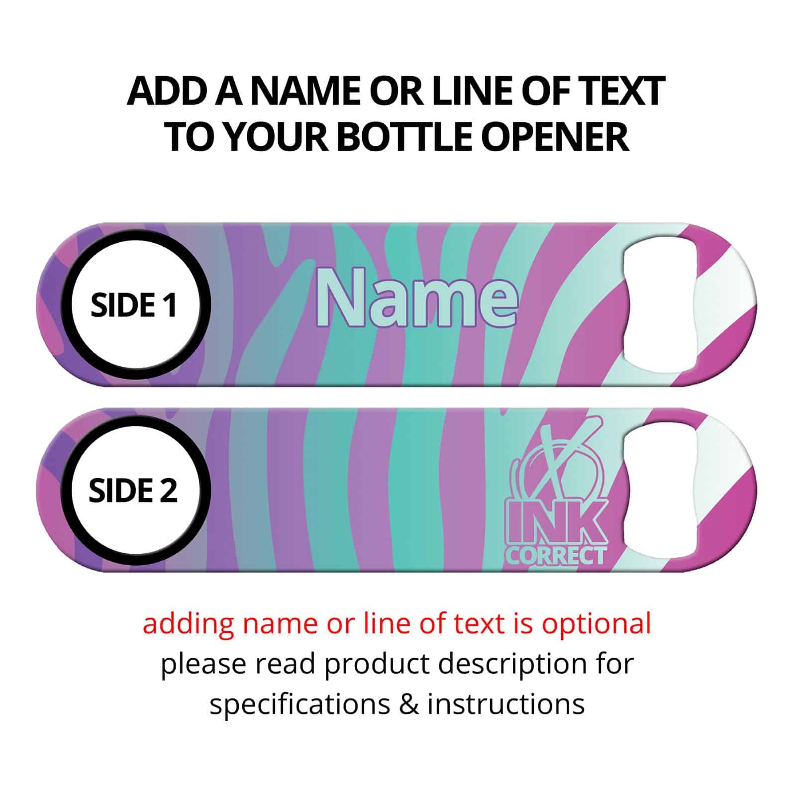 Super cute bartender speed opener featuring zebra animal print pattern design. Unique bar tool for professional bartenders as well as the home bar! Personalize your church key by adding your name or line of text.