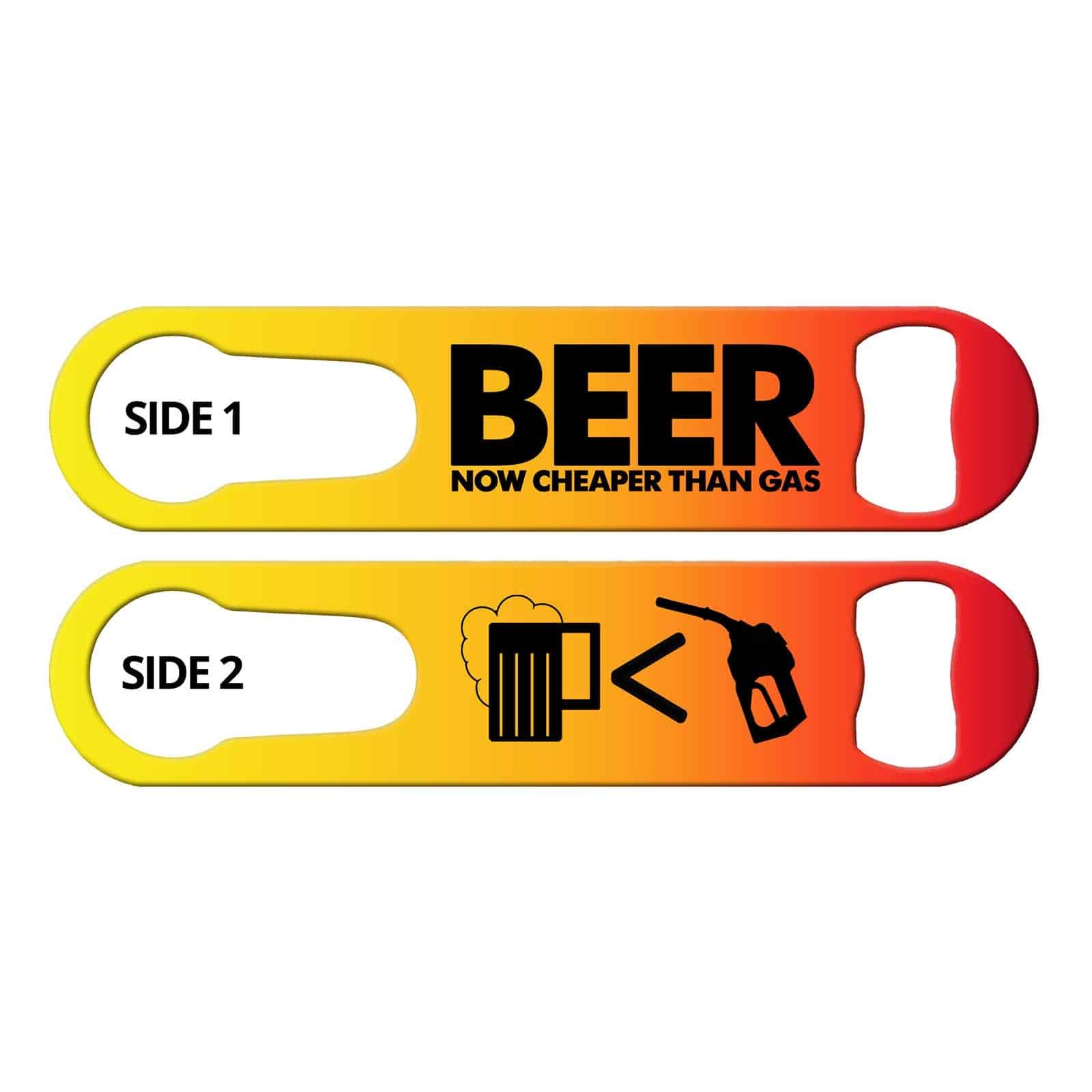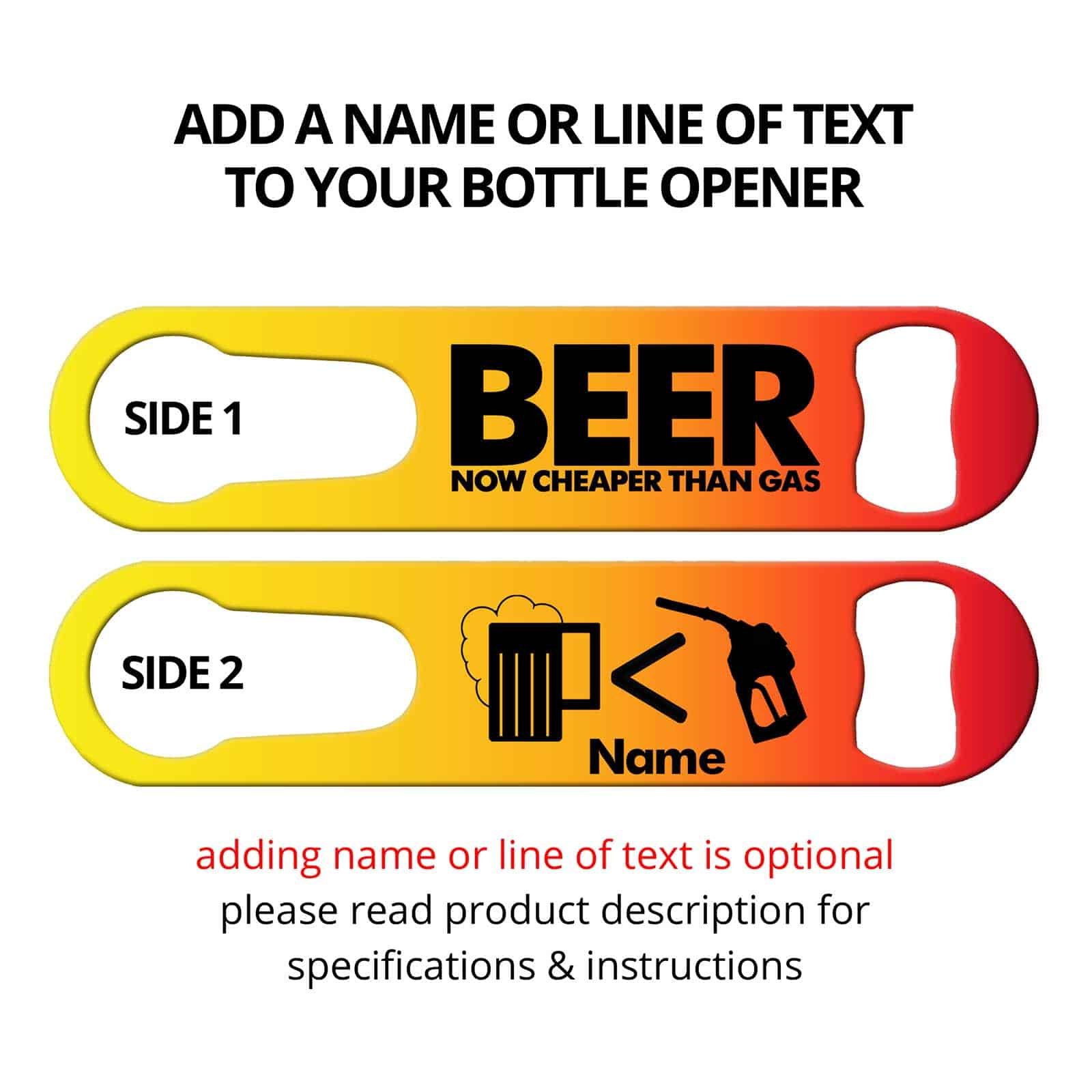 Funny bartender bottle opener featuring beer joke about gas prices. This unique multi-tool comes with a built-in pour spout remover and it’s offered in assorted colors! For professional bartenders as well as the home bar! Personalize this church key opener by adding a name or line or text.