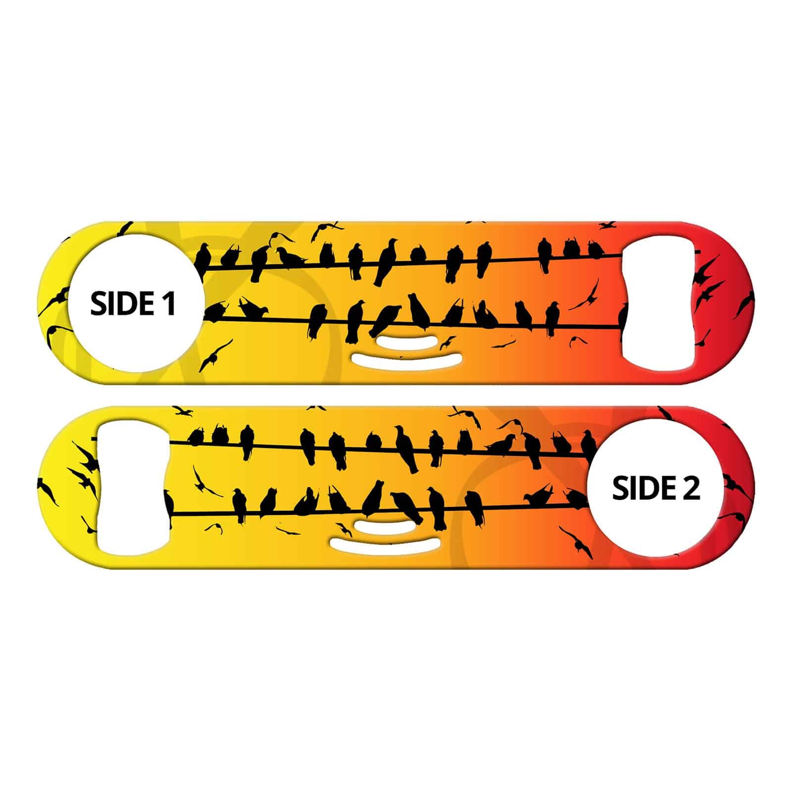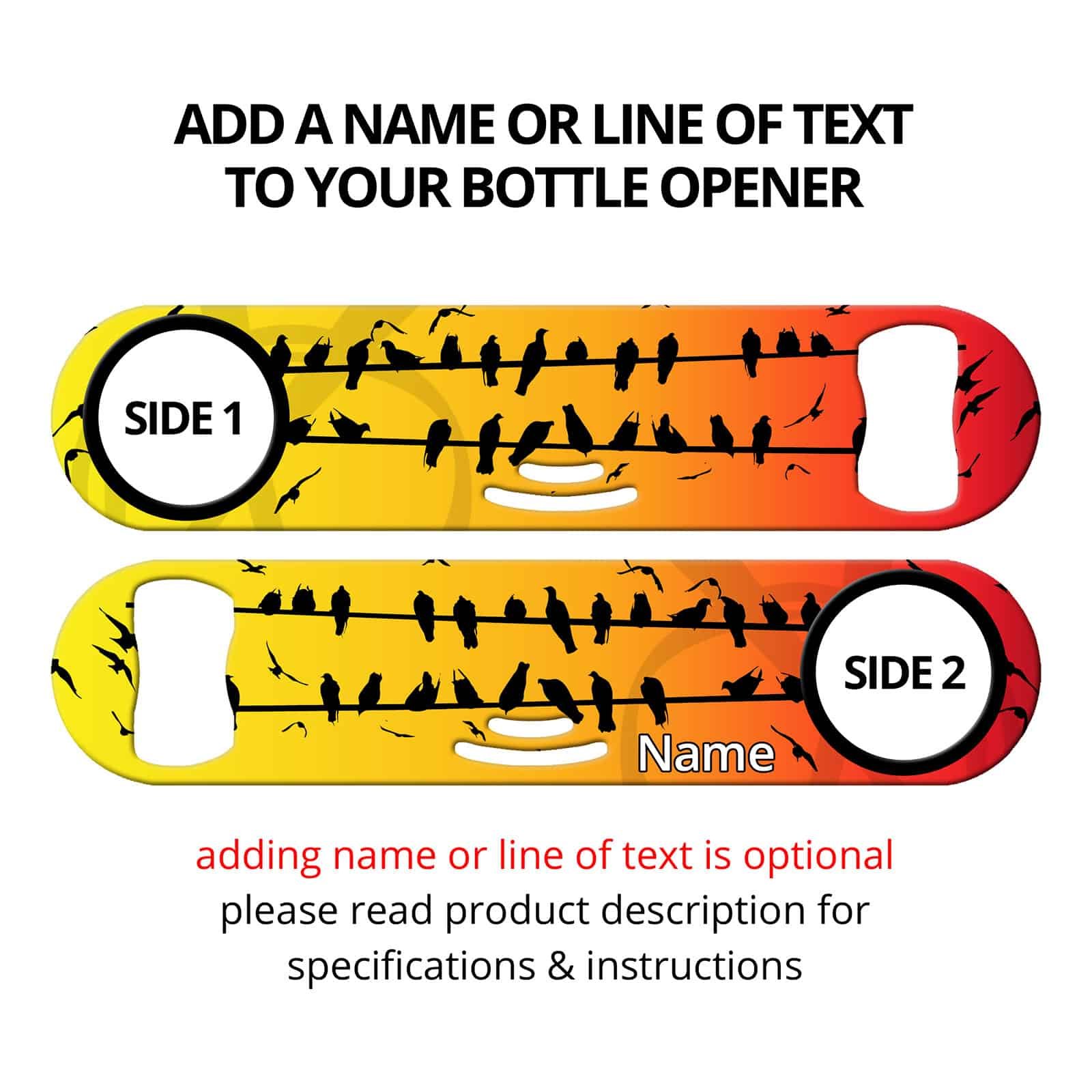 Creative bartender bottle opener featuring birds on a wire design. With a built-in cocktail strainer and can opener tip, this cool multi purpose bar tool is perfect for professional bartenders, as well as the home bar! Personalize your bar blade by adding your name or line or text.