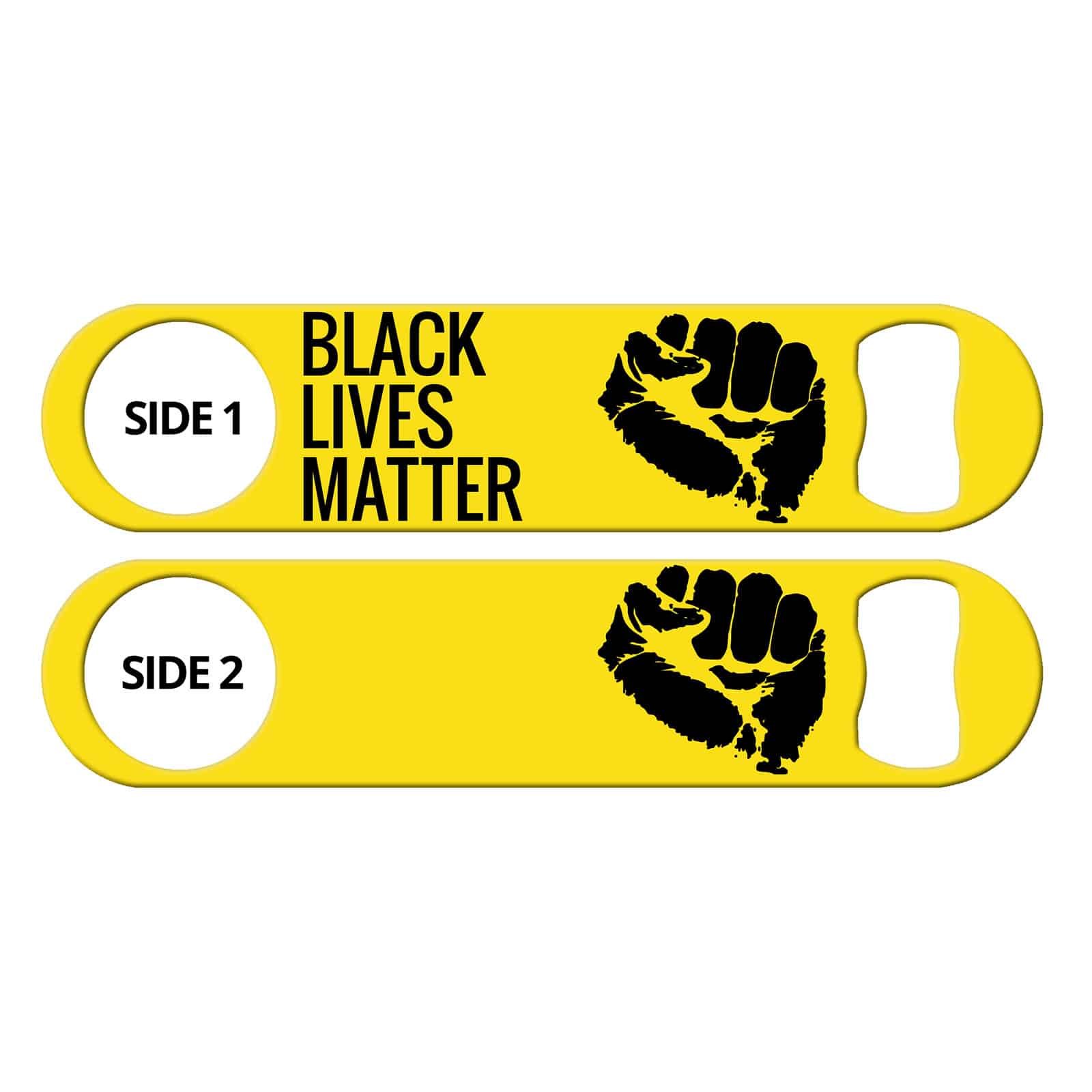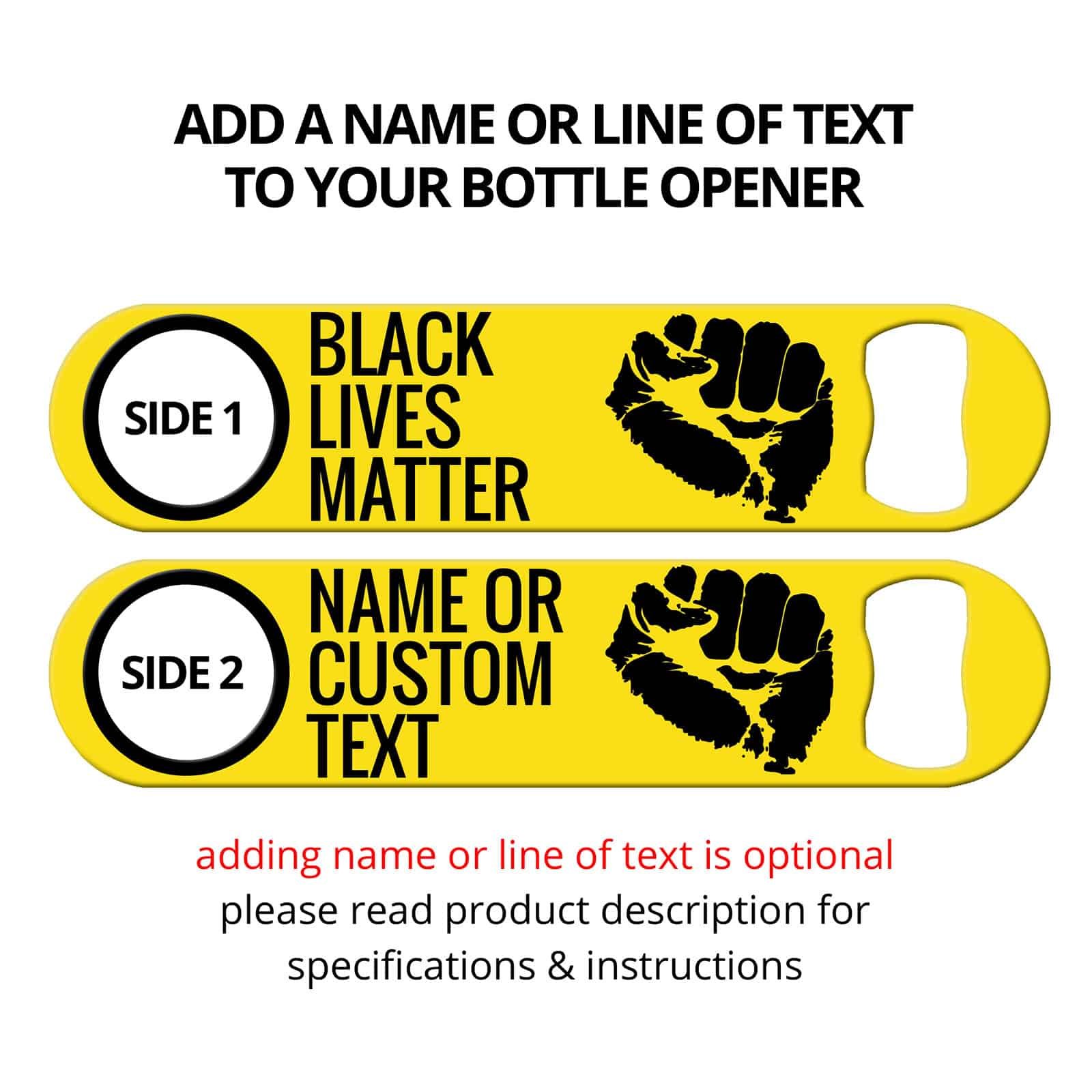 Raise awareness with our bartender bottle opener featuring Black Power Raised Fist. Great bar tool for professional bartenders and home bar! Personalize your church key by adding your name or text.