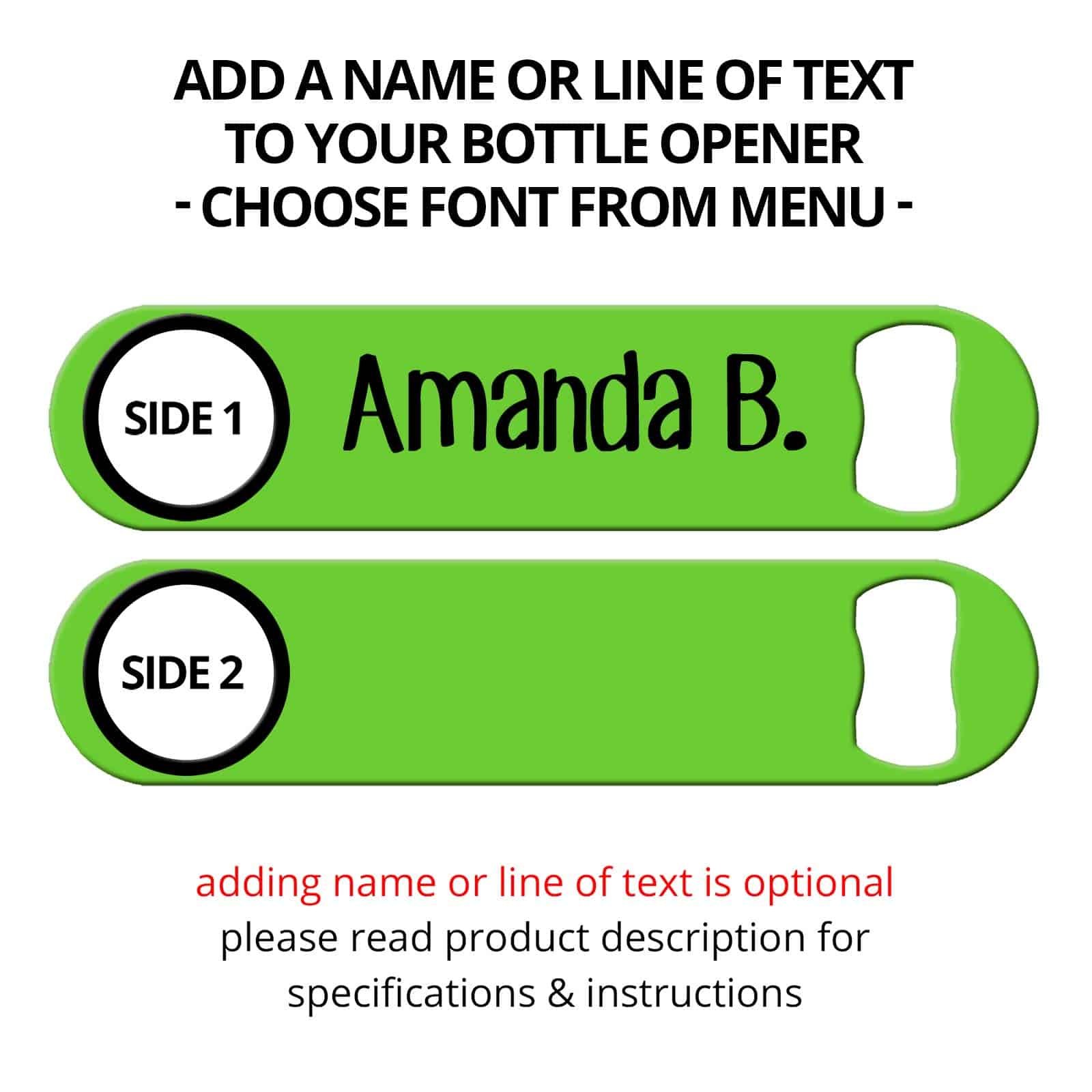 This green apple blank bar key is just stunning! Add your name or line of text to one or both sides. Choose from dozens of fonts! Never lose your bottle opener again! No more stolen bar blades! Tell them what’s up! Add a quote, joke or funny saying. Go crazy! Personalize below.