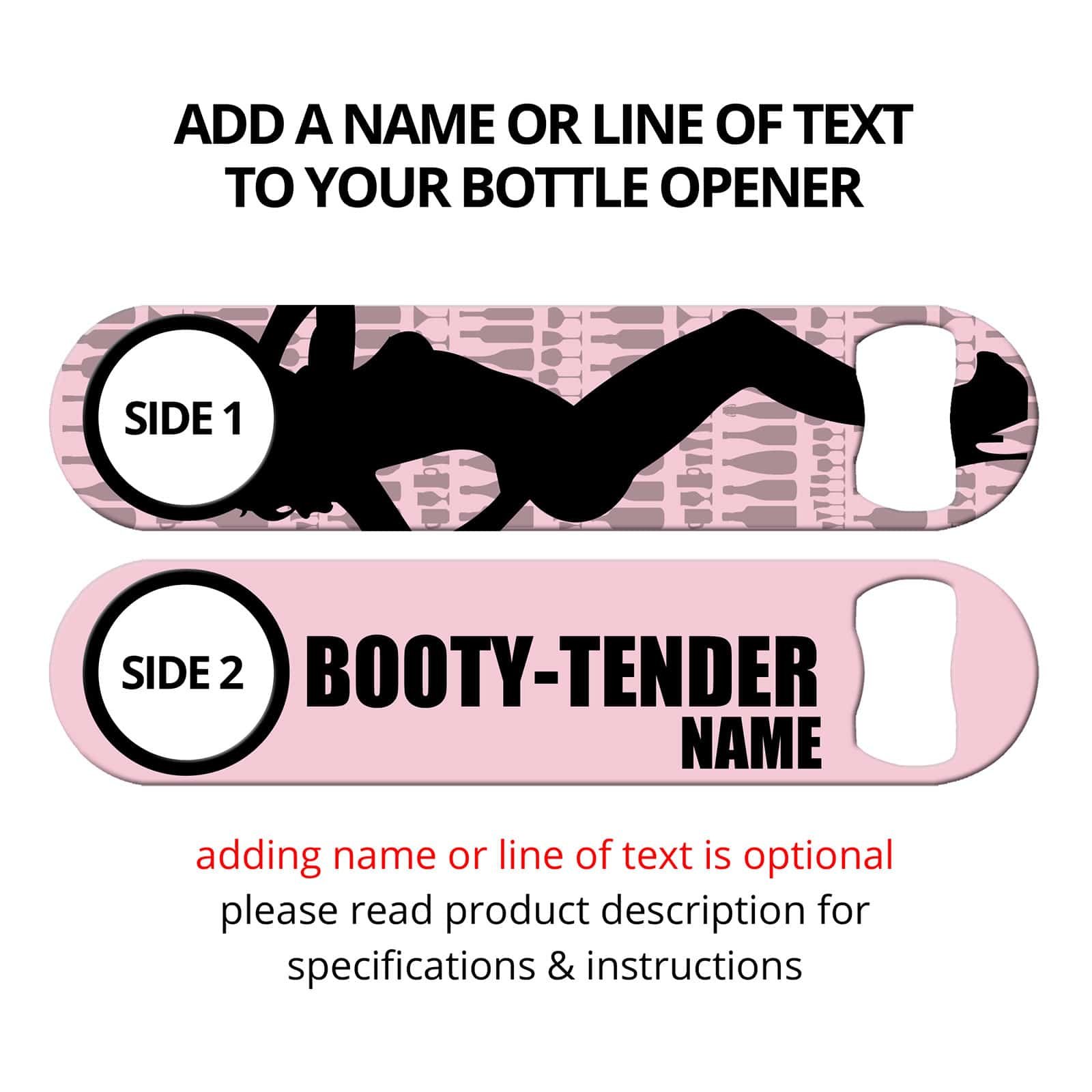 Sexy bartender bottle opener featuring bootylicious design with sexy dancer girl silhouette. Awesome bar tool for professional bartenders, as well as the home bar! Personalize your bar blade by adding your name or line of text.
