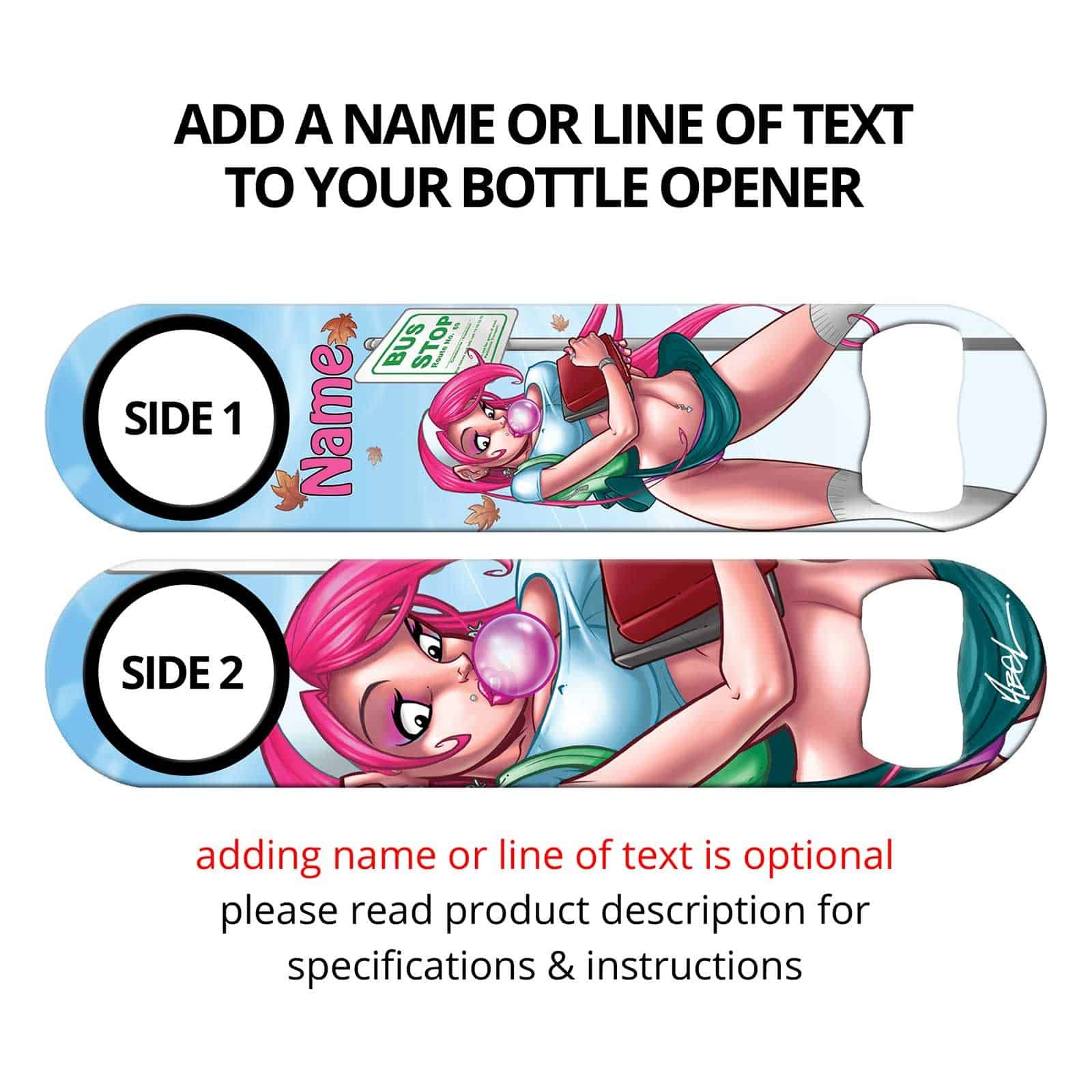 Bartender bottle opener featuring sexy girl with pink hair and bubble gum. Commissioned art from world famous Martin Abel. Exclusive to Ink Correct! Unique bar tool for professional bartenders, as well as a great addition to your home bar! Personalize your speed opener by adding your name or line of text.