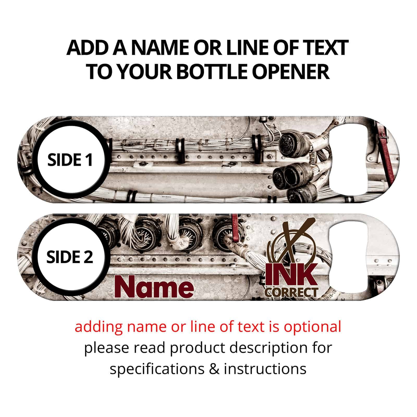 Grungy bartender bottle opener featuring cables and wires realistic background. Unique bar tool for professional bartenders, as well as a great addition to your home bar! Personalize your speed opener by adding your name or line of text.