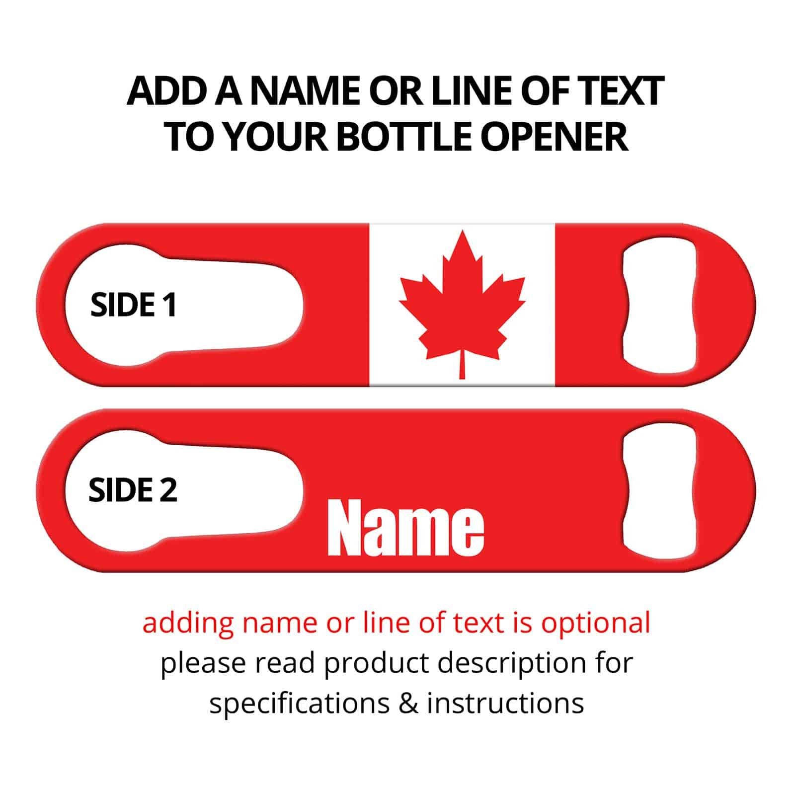 Bartender bottle opener featuring Canadian Flag. Show your pride!! Show your pride!! Convenient built-in pour spout remover. Perfect for professional bartenders as well as the home bar! Personalize this church key opener by adding a name or line or text. See all our Country Flags.