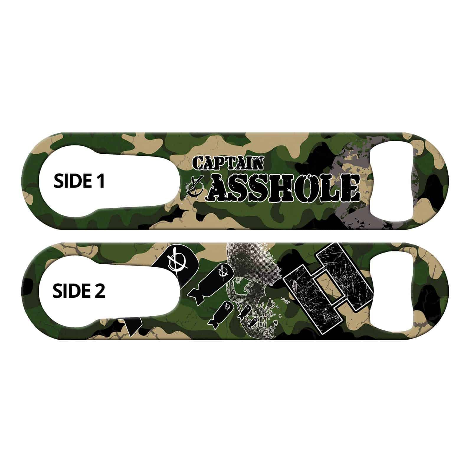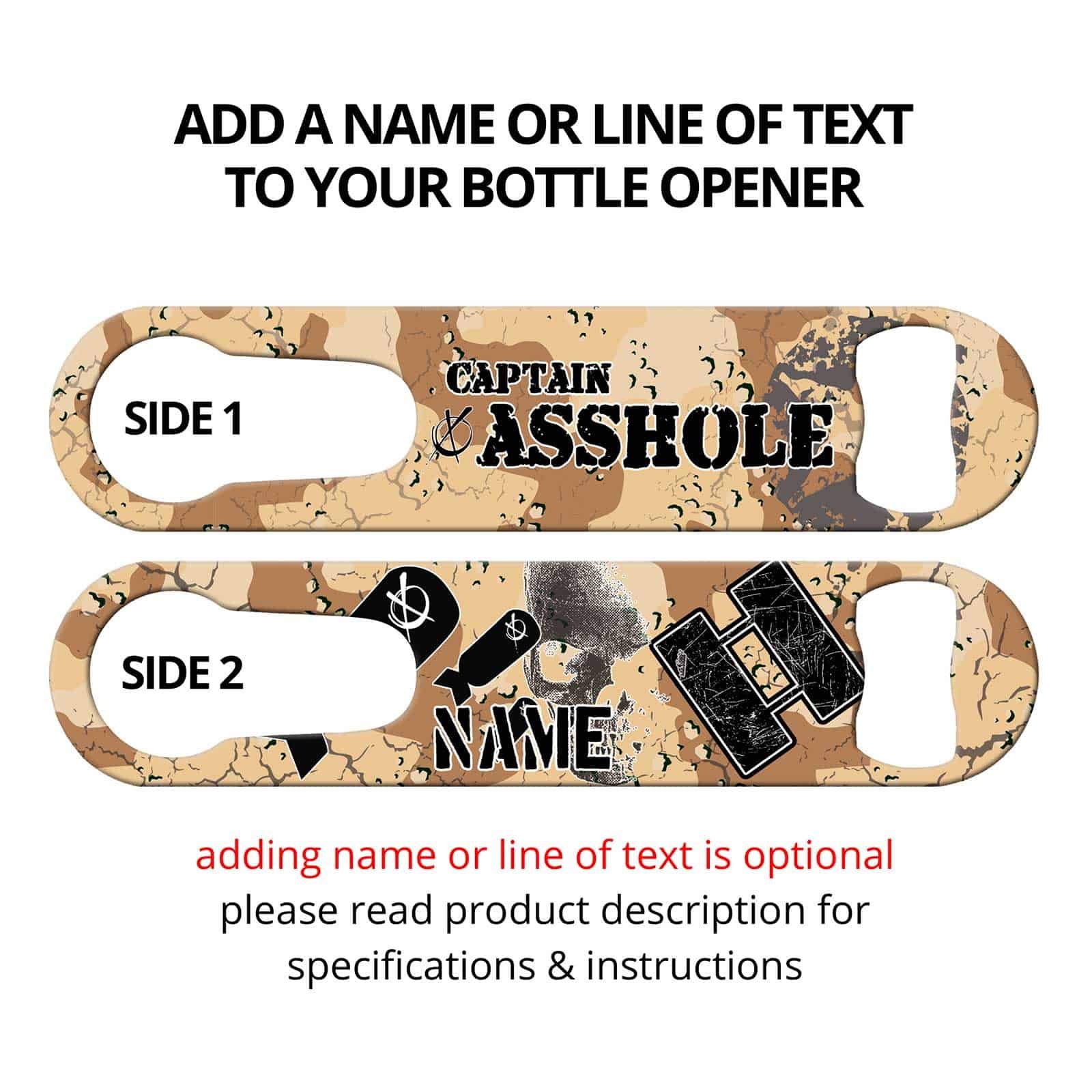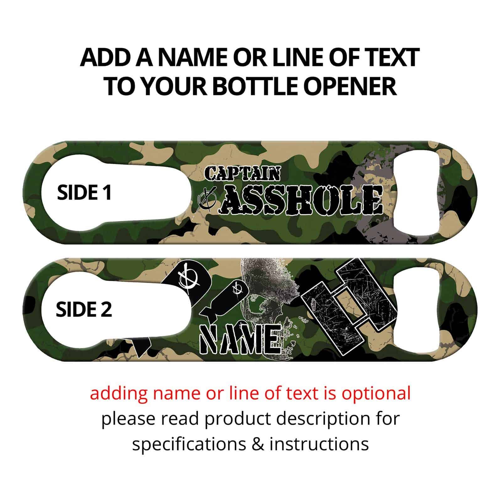Funny bottle opener with convenient built-in pour spout remover. Features Captain Asshole design in camouflage. Assorted camo colors available. Perfect for professional bartenders as well as the home bar! Personalize this church key opener by adding a name or line or text.
