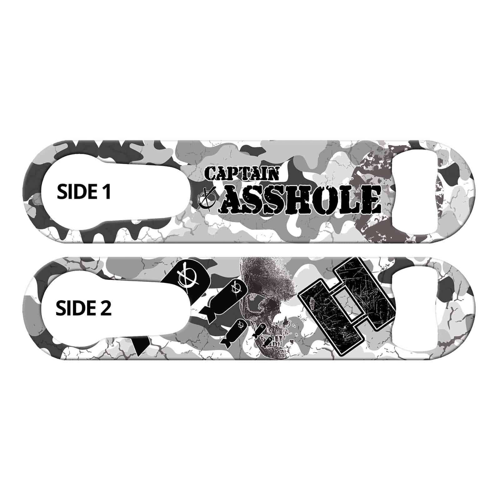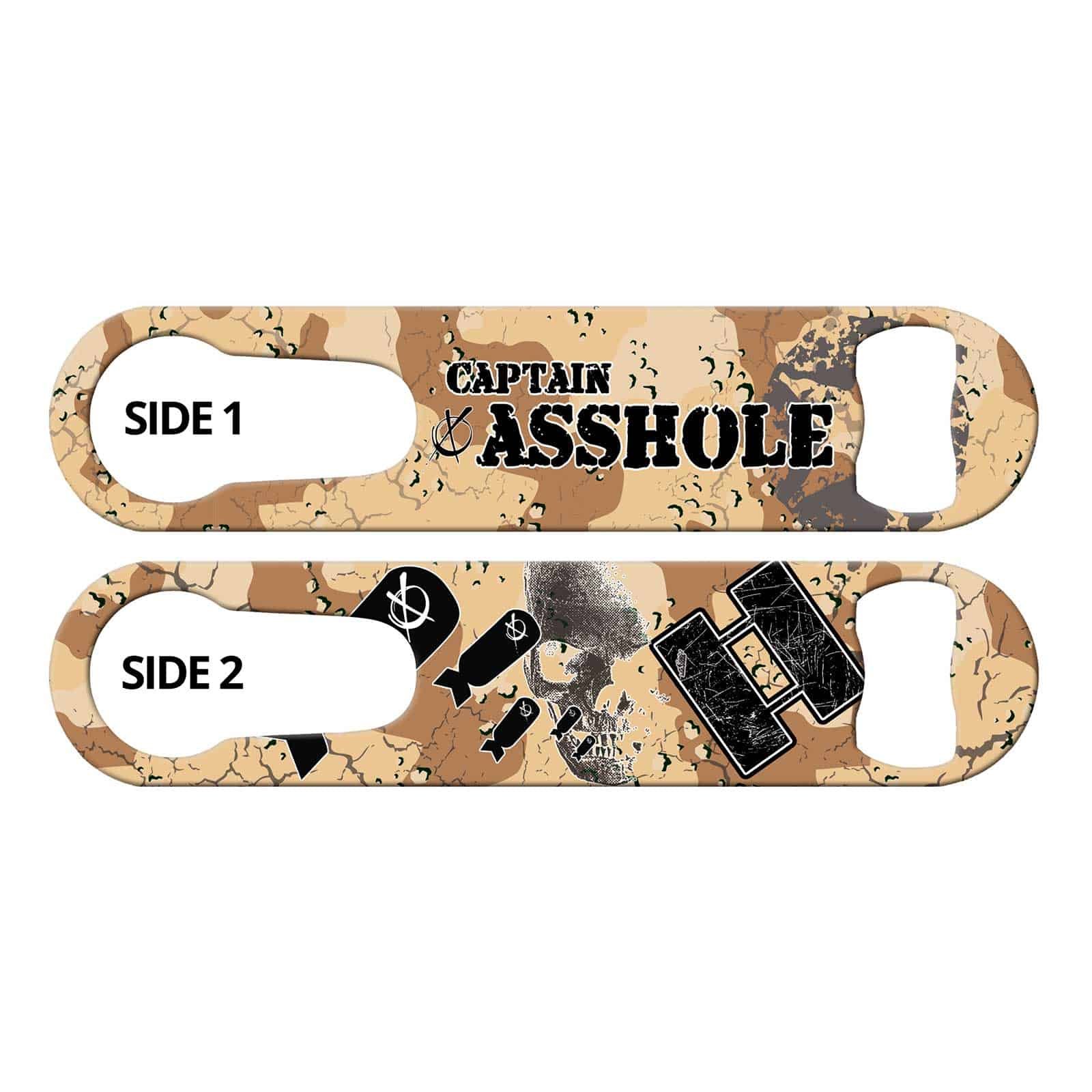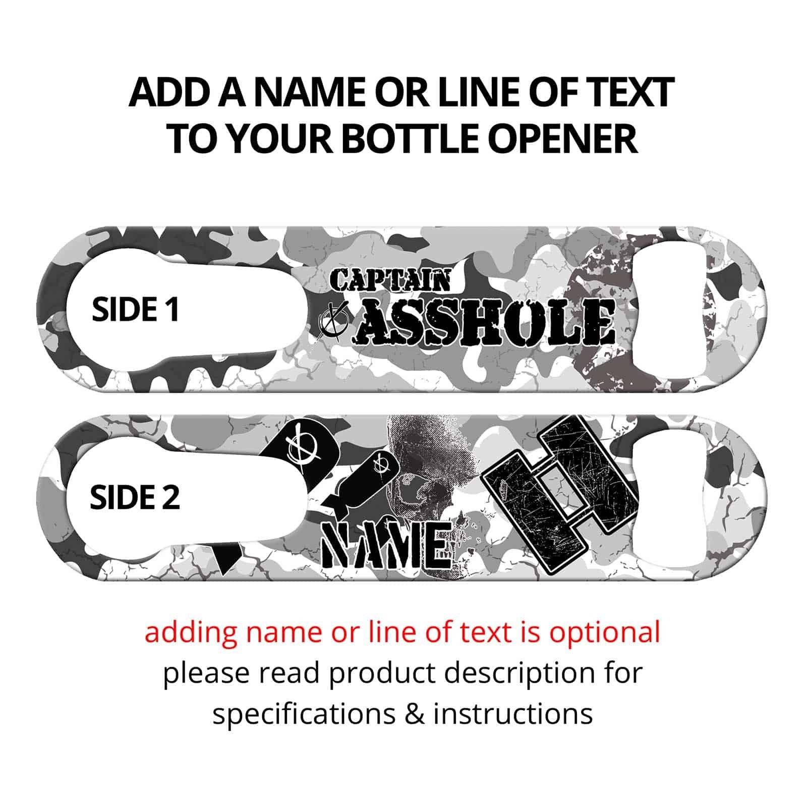 Funny bottle opener with convenient built-in pour spout remover. Features Captain Asshole design in camouflage. Assorted camo colors available. Perfect for professional bartenders as well as the home bar! Personalize this church key opener by adding a name or line or text.