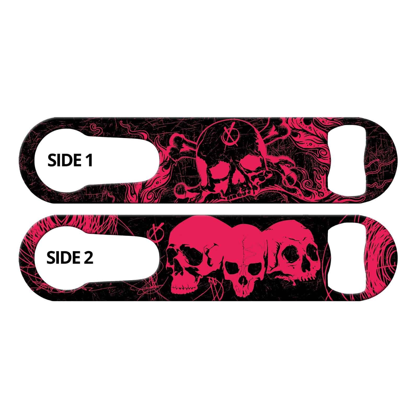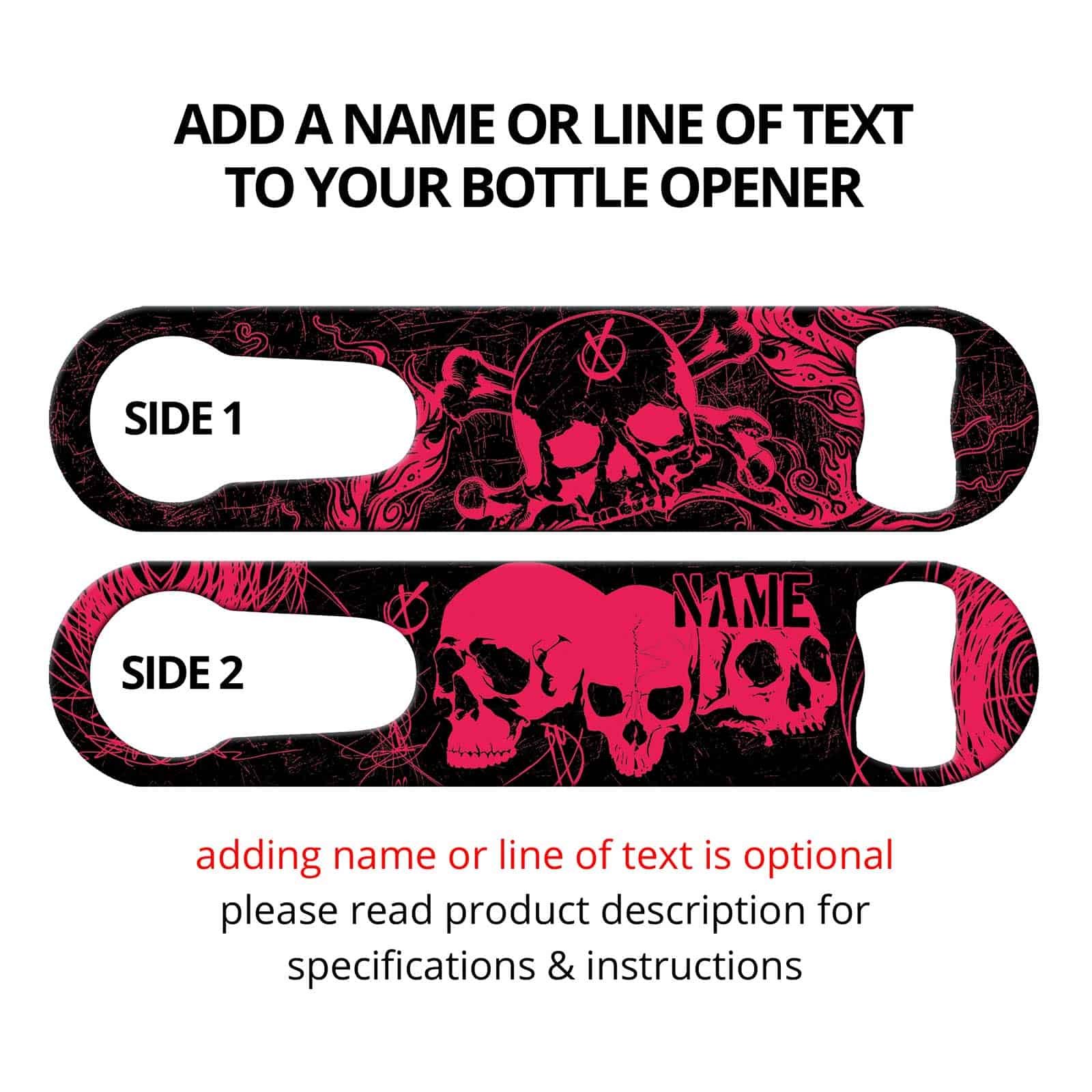 Bartender bottle opener featuring badass design with bones and skulls. This unique multi-tool comes with a built-in pour spout remover and it’s offered in assorted colors! For professional bartenders as well as the home bar! Personalize this church key opener by adding a name or line or text.