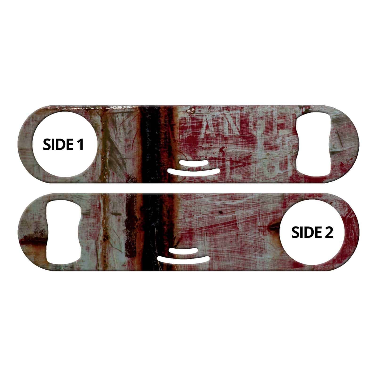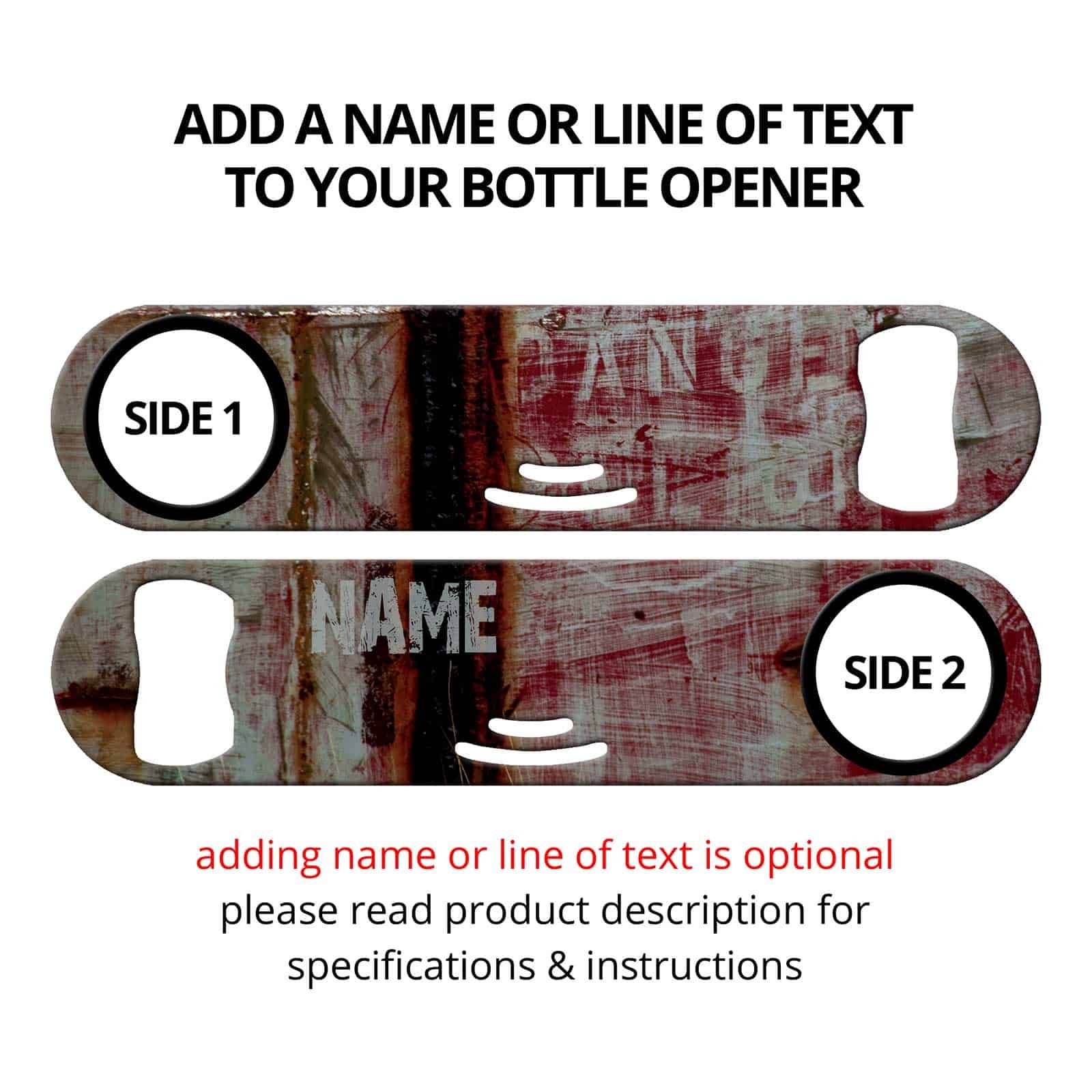 Grungy bottle opener featuring Danger design in red with realistic background! Convenient built-in cocktail strainer and can opener tip. No more broken nails! This multi purpose bar tool is perfect for professional bartenders as well as the home bar! Personalize this church key opener by adding a name or line or text.