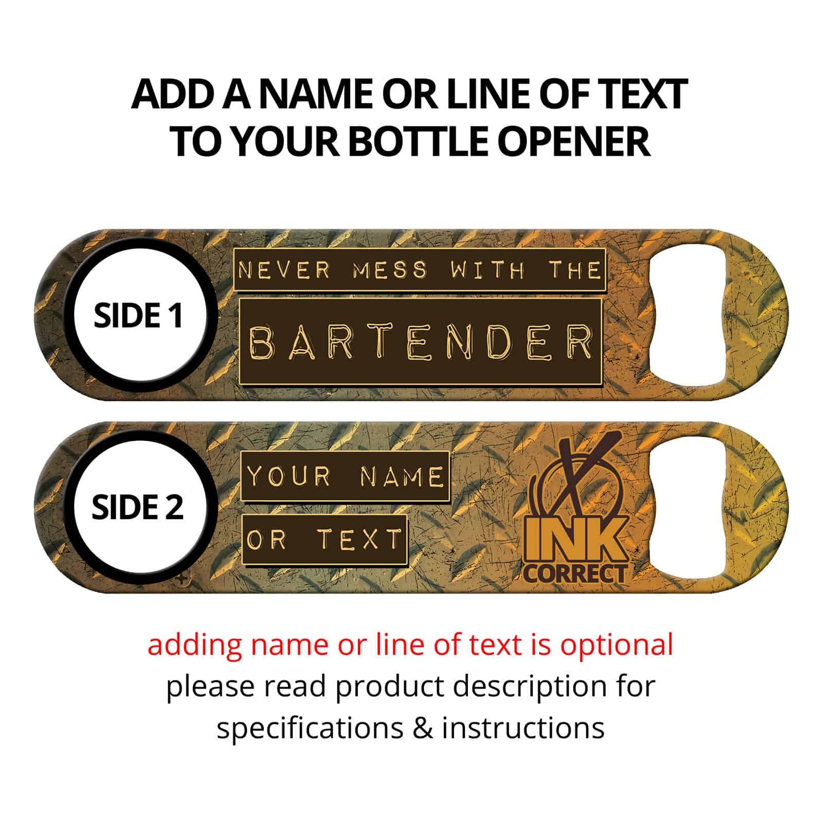 Grungy bartender bottle opener featuring diamond plates metallic background. Unique bar tool for professional bartenders, as well as a great addition to your home bar! Personalize your speed opener by adding your name or line of text.
