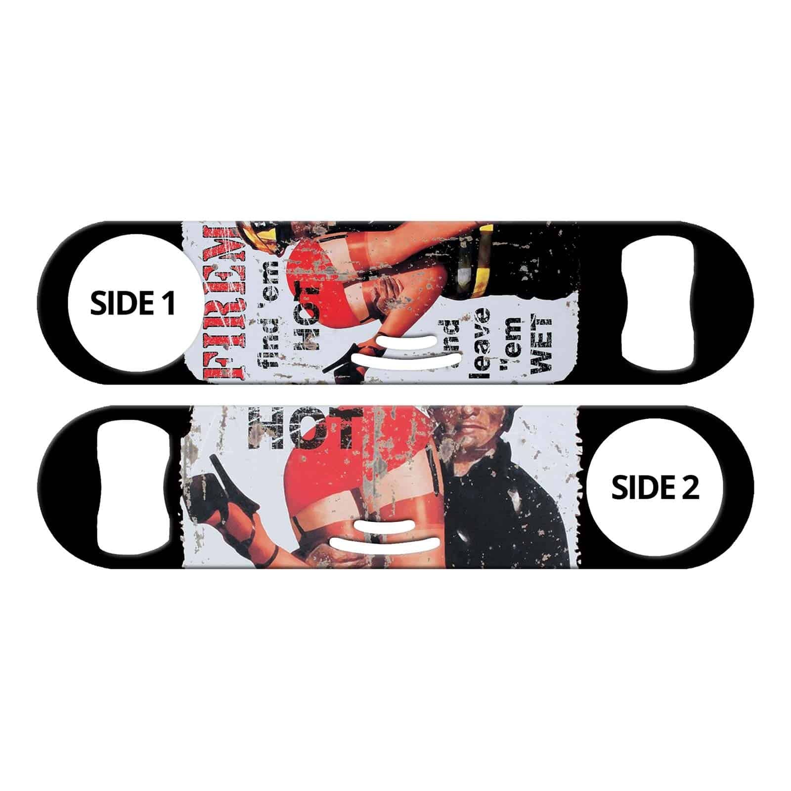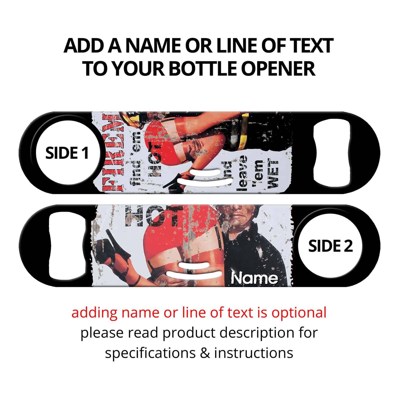 Badass speed bottle opener featuring firefighter design. Built-in cocktail strainer and can opener tip. This cool multi purpose bar tool is perfect for professional bartenders, as well as the home bar! Personalize your bar blade by adding your name or line or text.