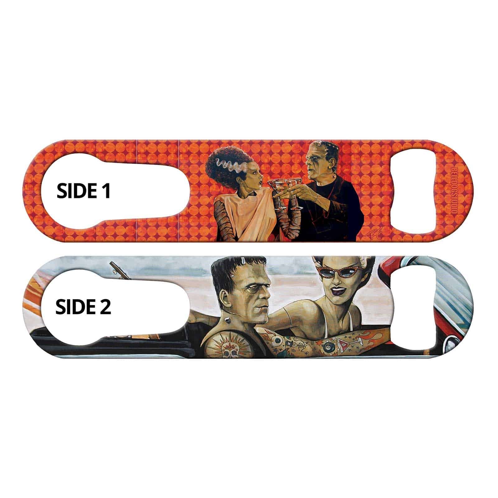 Bartender bottle opener featuring retro design. Commissioned art from BELLDOG Studio by Mike Bell. Exclusive to Ink Correct! Convenient built-in pour spout remover. Unique bar tool for professional bartenders, as well as a great addition to your home bar! Personalize your speed opener by adding your name or line of text.