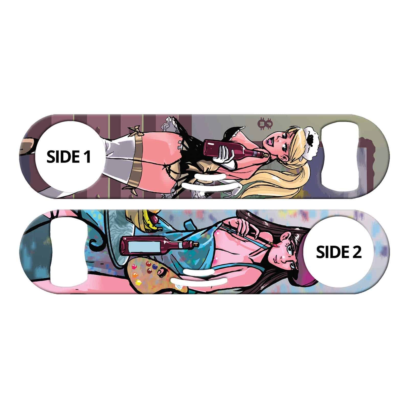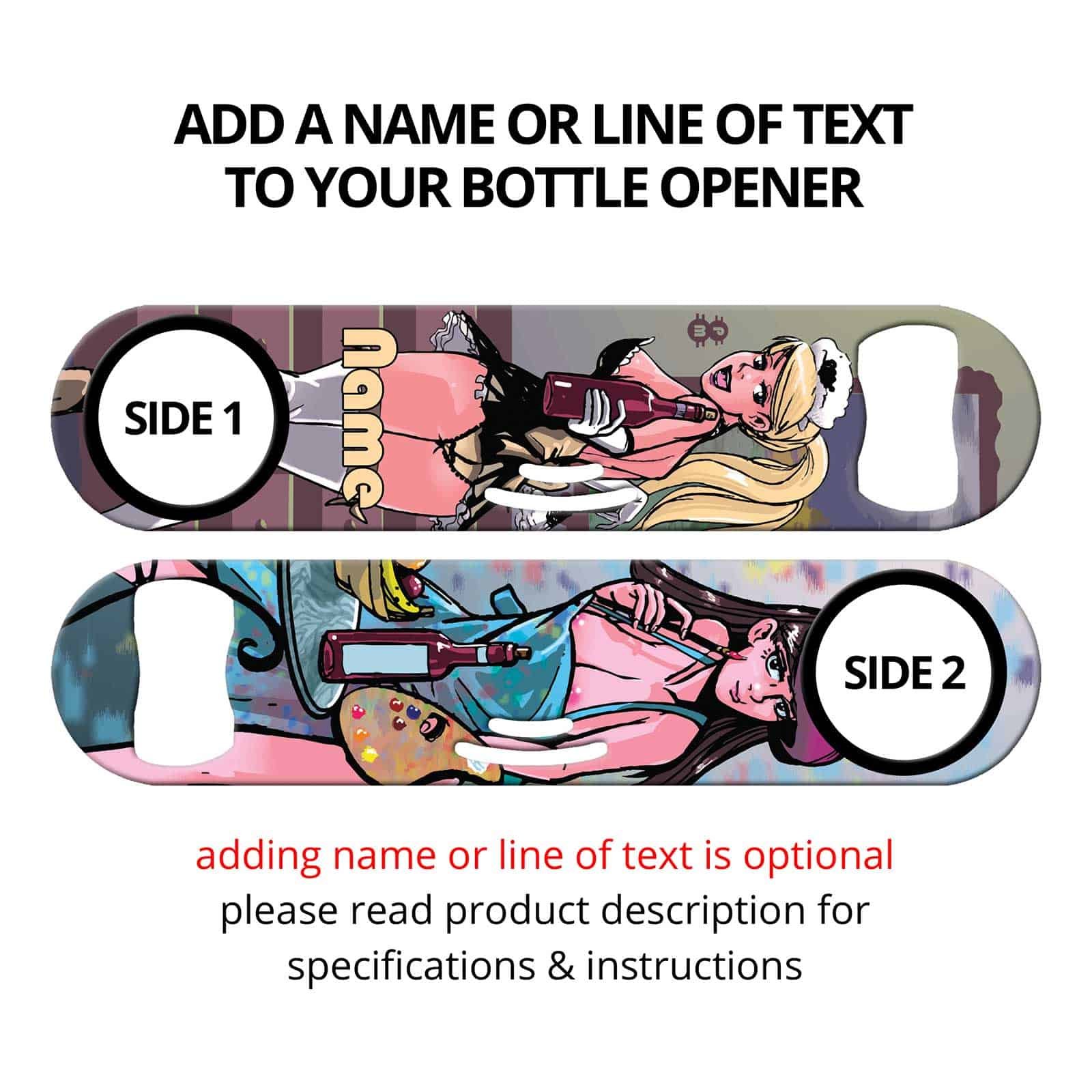 Bartender bottle opener featuring sexy girls design. Commissioned art from Phil Milley. Exclusive to Ink Correct! Built-in cocktail strainer and can opener tip. Unique bar tool for professional bartenders, as well as a great addition to your home bar! Personalize your speed opener by adding your name or line of text.
