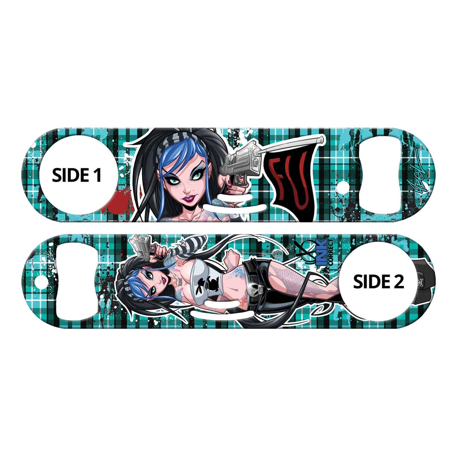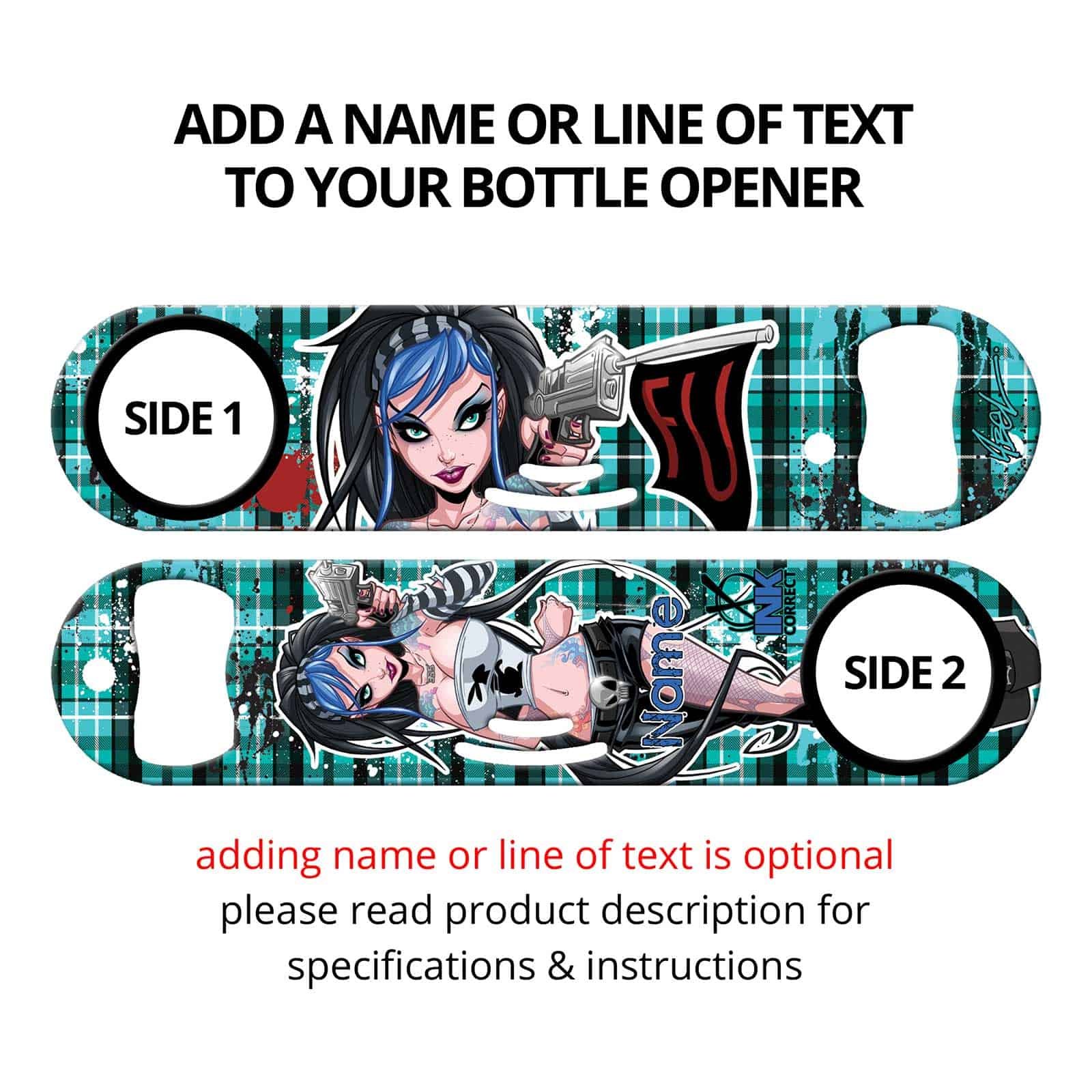 Bartender bottle opener featuring sexy sexy girl with blue hair telling you to go fuck yourself. Commissioned art from world famous Martin Abel. Exclusive to Ink Correct! Built-in cocktail strainer and can opener tip. No more broken nails! Unique bar tool for professional bartenders, as well as a great addition to your home bar! Personalize your speed opener by adding your name or line of text.