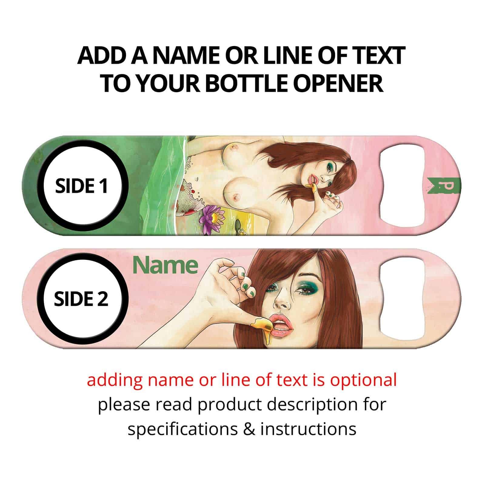 Bartender bottle opener featuring commissioned art by Keith P. Rein (The P is for Penis). Exclusive to Ink Correct! Unique bar tool for professional bartenders, as well as a great addition to your home bar! Personalize your speed opener by adding your name or line of text.