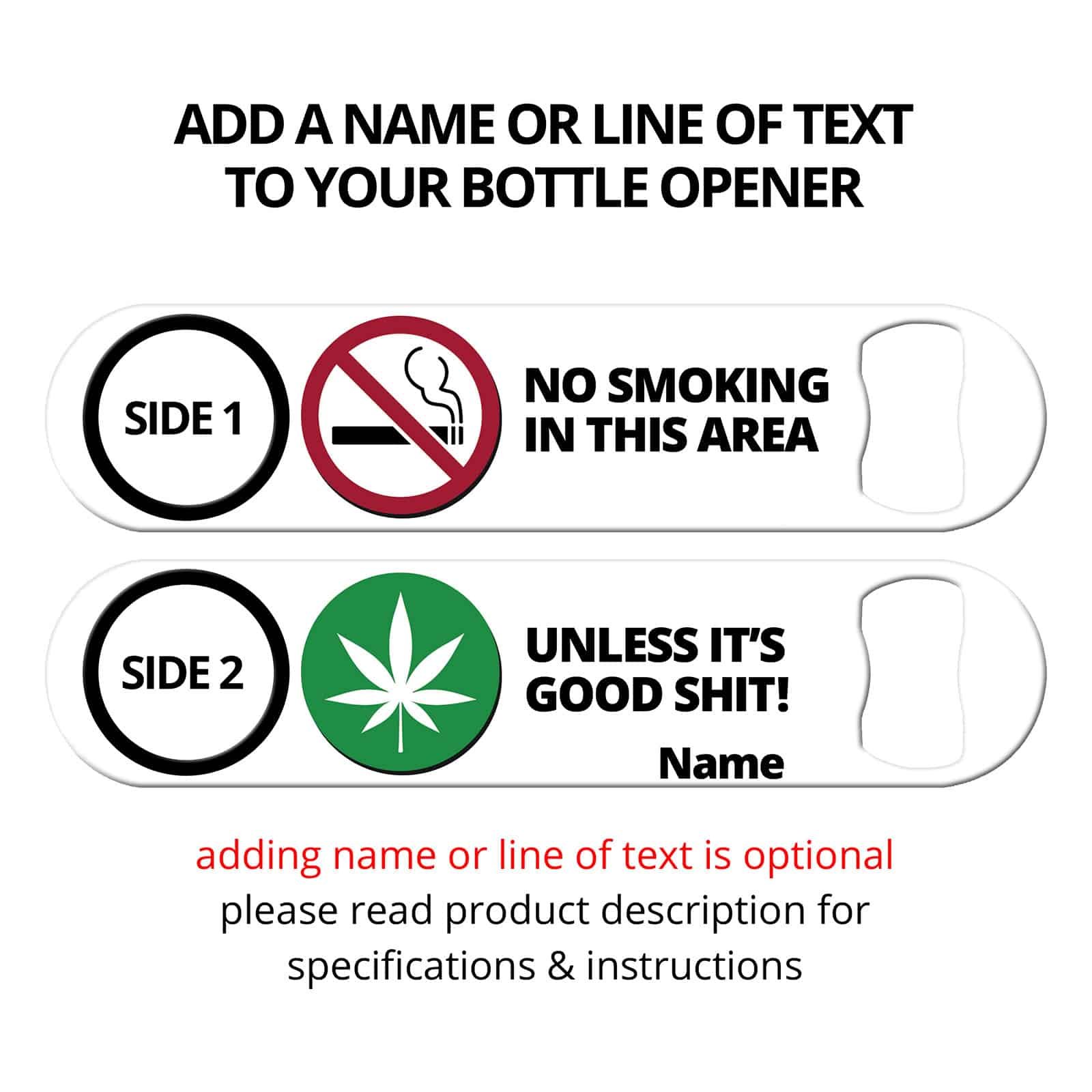 Funny bottle opener featuring weed joke! Fun bar tool for professional bartenders who like to toke up, as well as the stoner who bartends! Also looks great in the home bar. Personalize your speed opener by adding your name or line text.