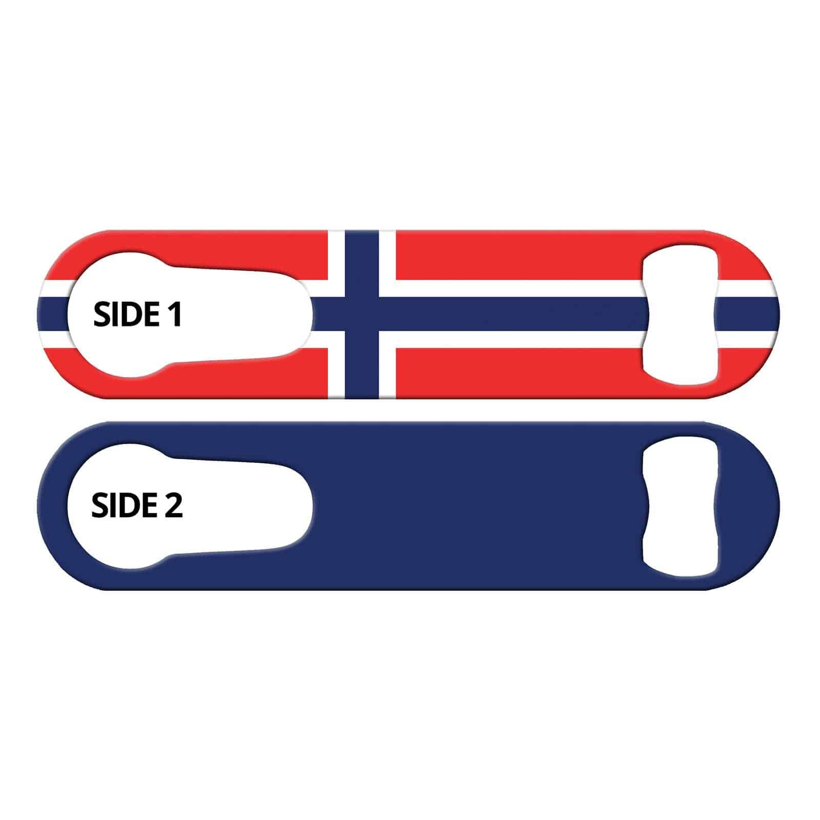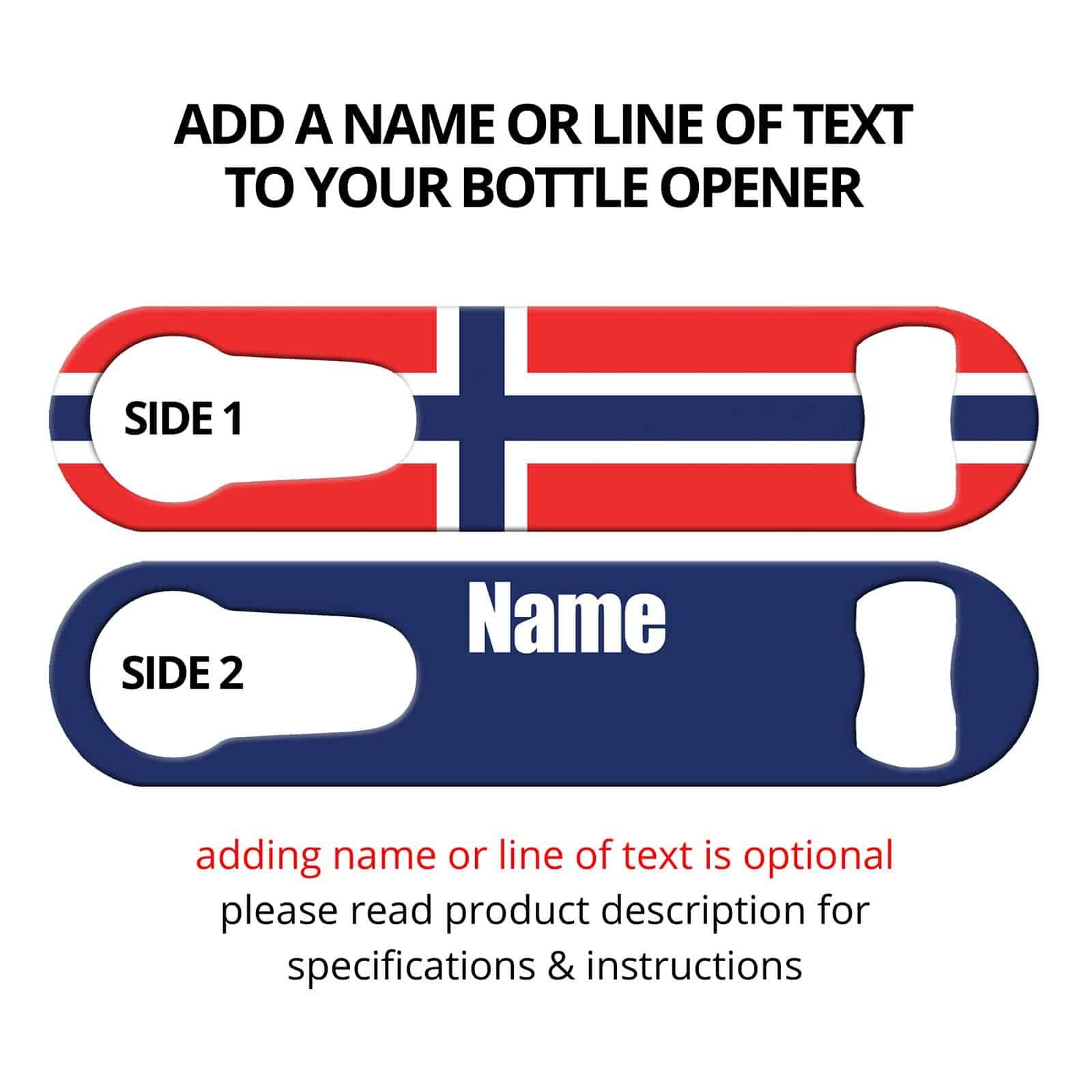 Bartender bottle opener featuring Norway Flag. Show your pride!! Show your pride!! Convenient built-in pour spout remover. Perfect for professional bartenders as well as the home bar! Personalize this church key opener by adding a name or line or text. See all our Country Flags.