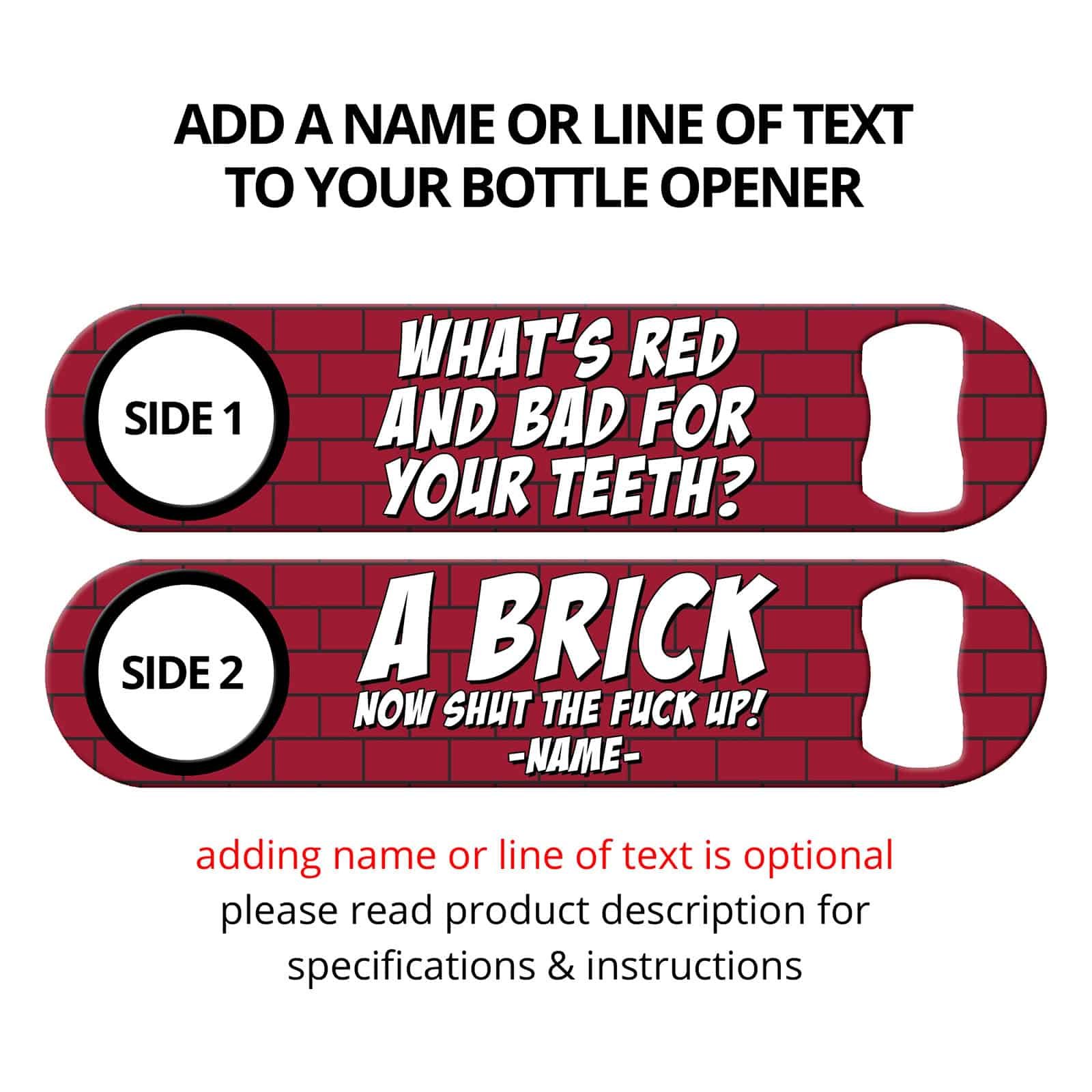 Funny bottle opener featuring bartender joke on red brick background. Practical bar tool for professional bartenders! Also looks great in the home bar. Personalize your speed opener by adding your name or line text.
