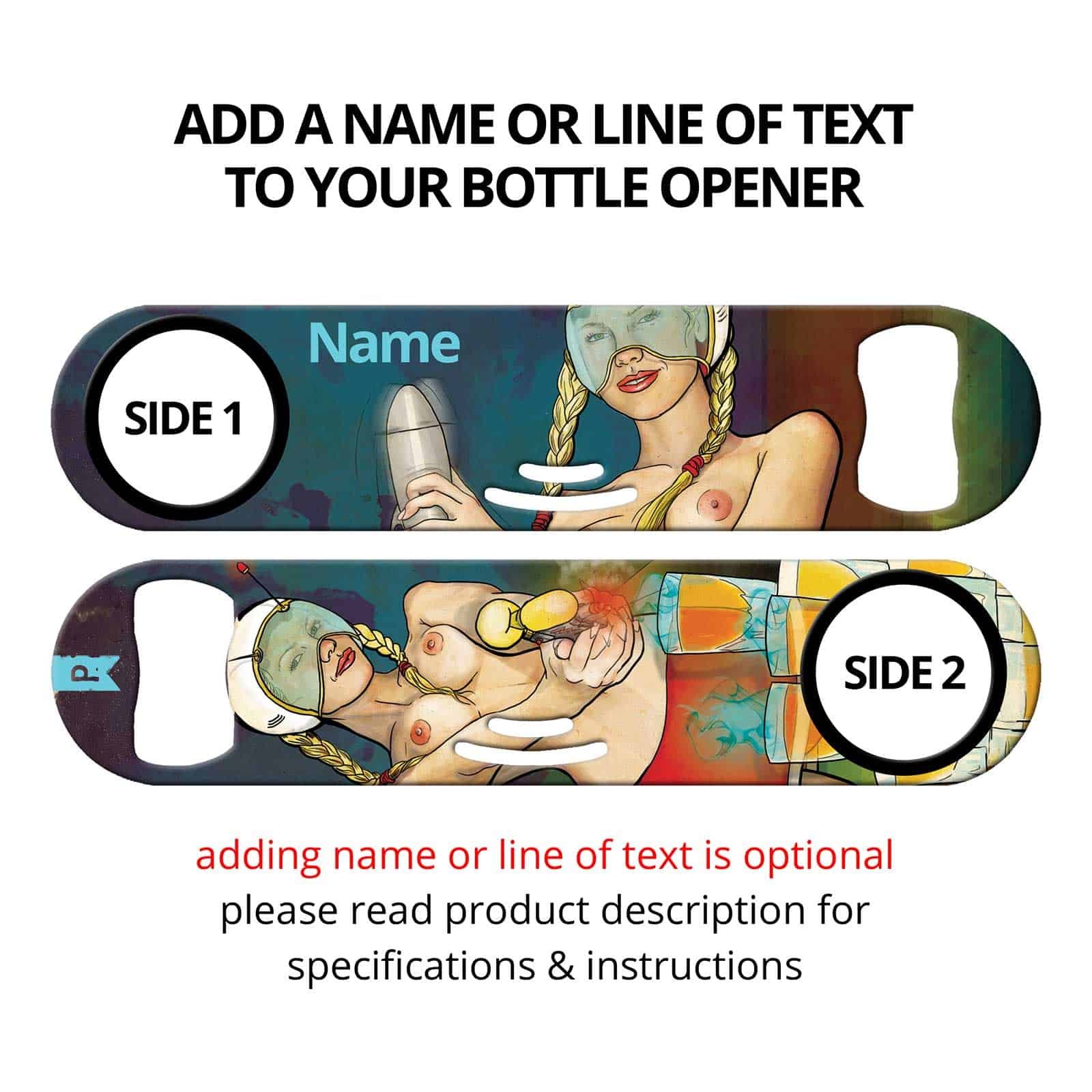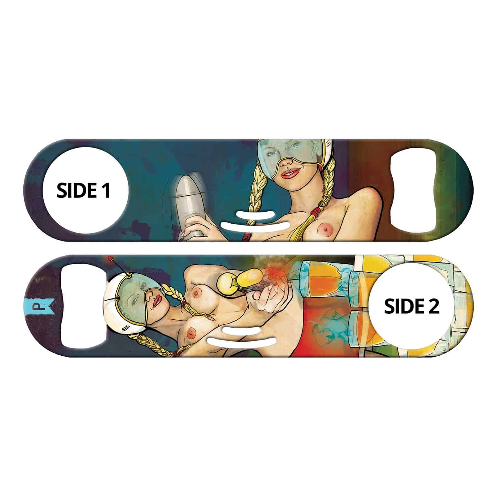 Bartender bottle opener featuring commissioned art by Keith P. Rein (The P is for Penis). Built-in cocktail strainer and can opener tip. Unique bar tool for professional bartenders, as well as a great addition to your home bar! Personalize your speed opener by adding your name or line of text.