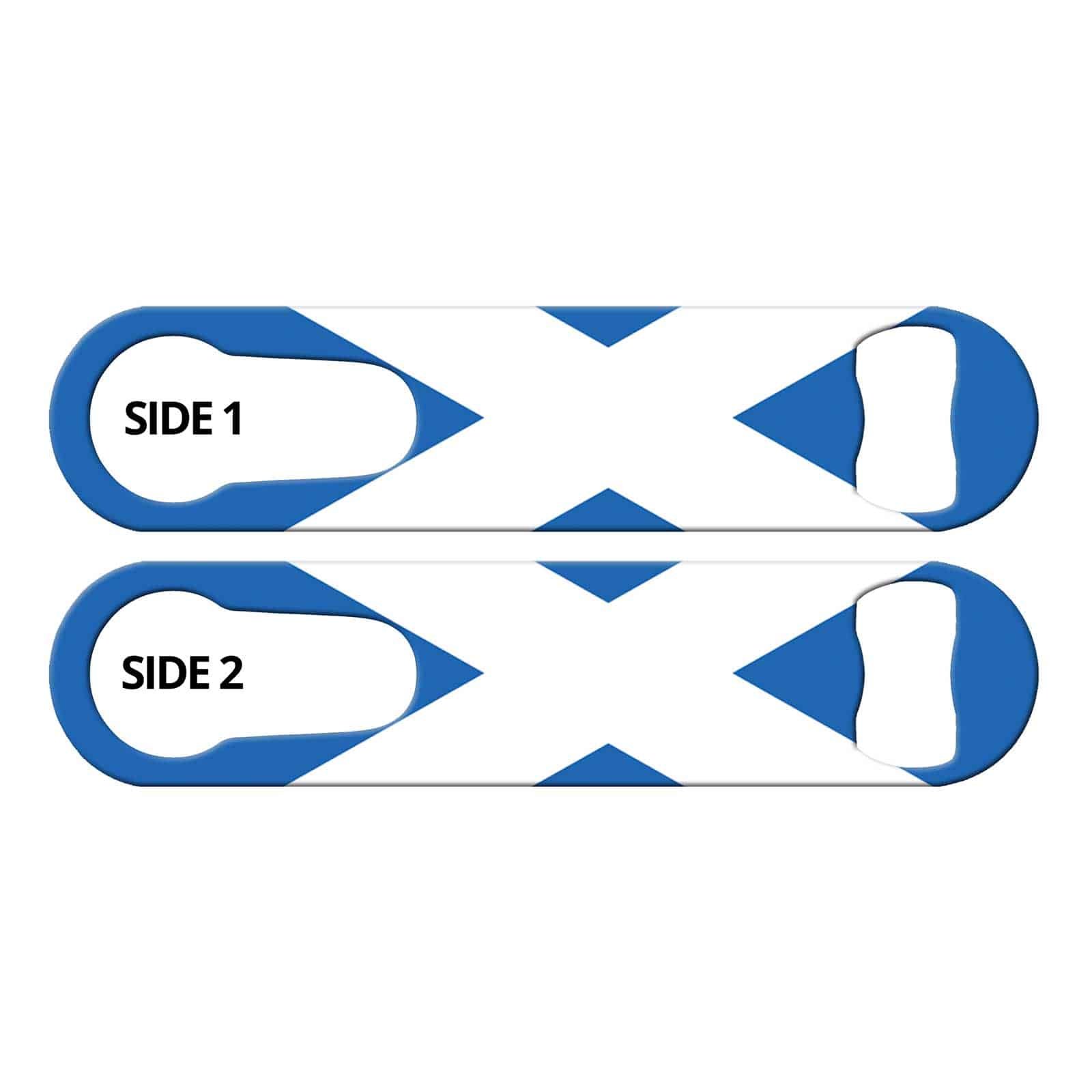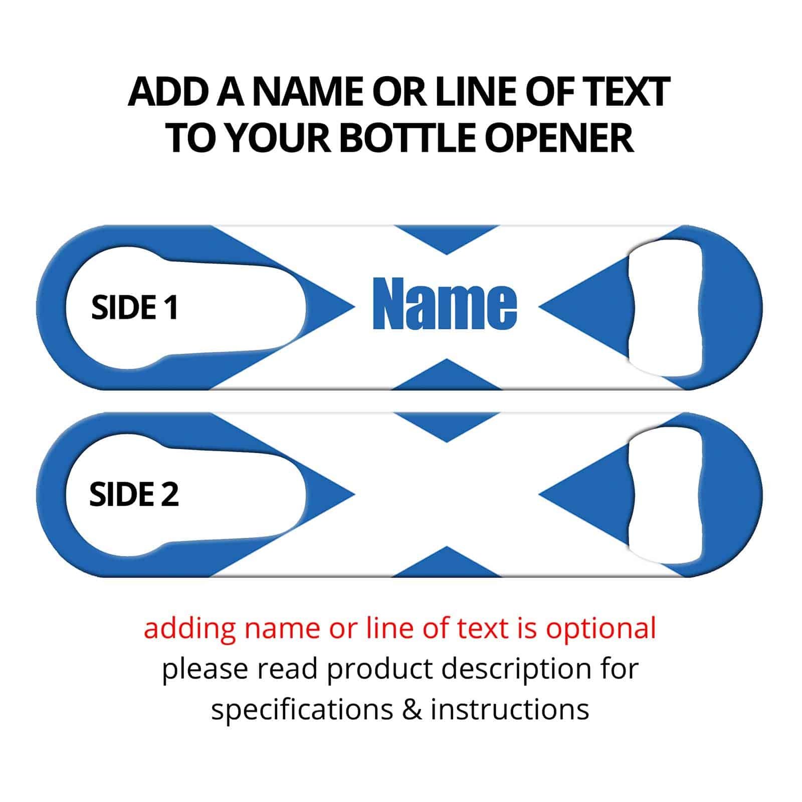 Bartender bottle opener featuring Scotland Flag. Show your pride!! Show your pride!! Convenient built-in pour spout remover. Perfect for professional bartenders as well as the home bar! Personalize this church key opener by adding a name or line or text. See all our Country Flags.