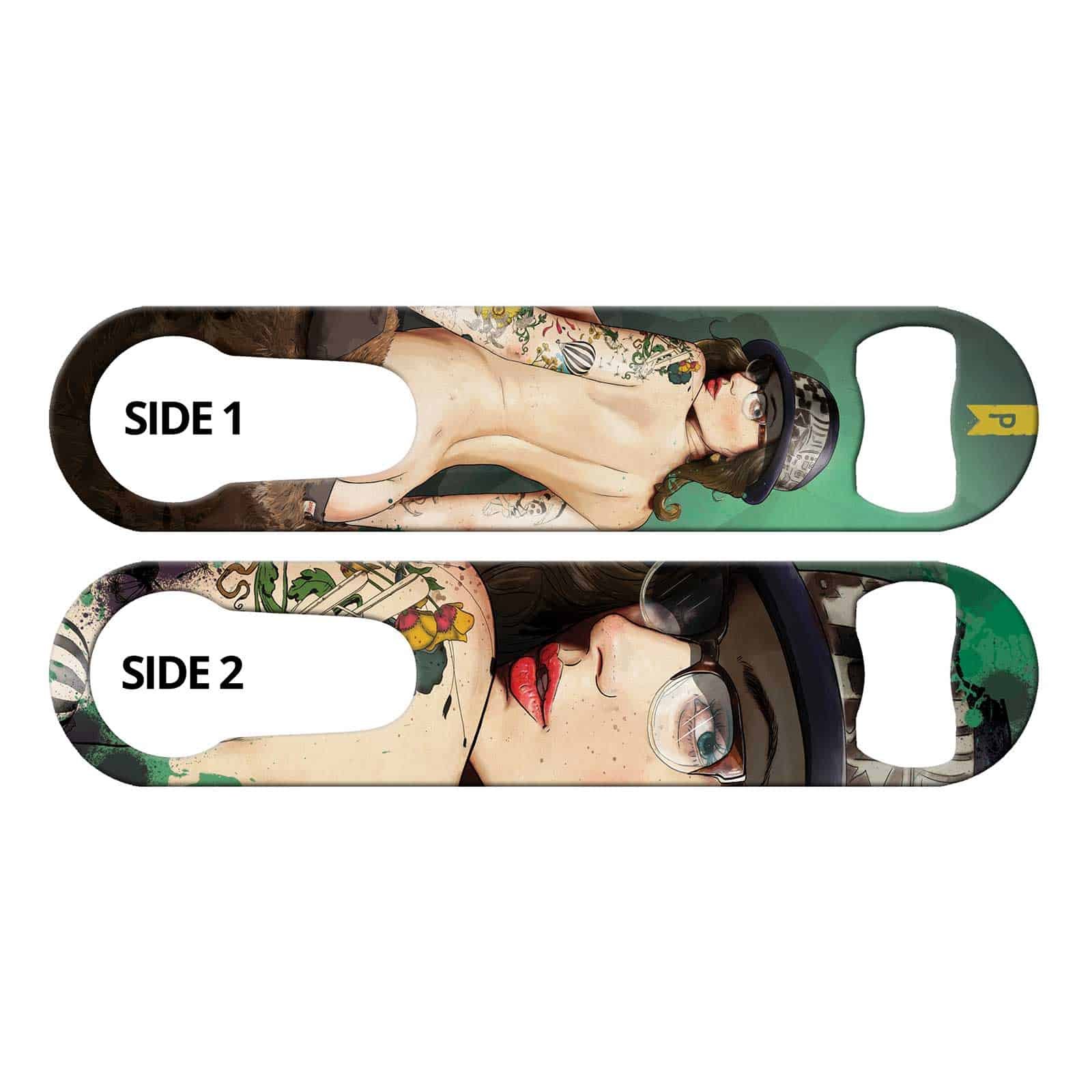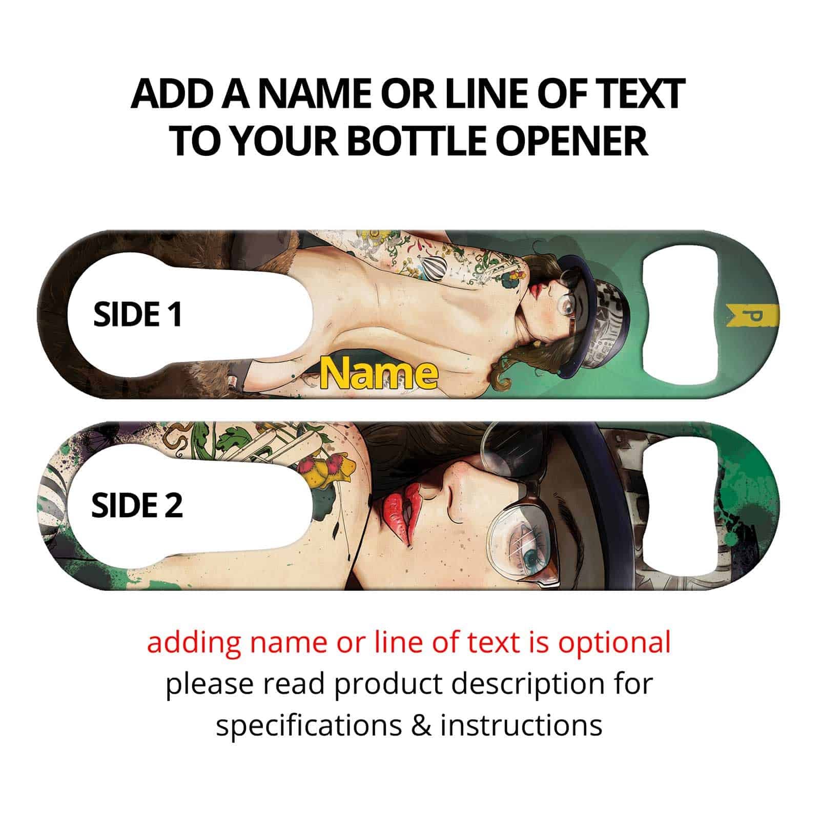 Bartender bottle opener featuring commissioned art by Keith P. Rein (The P is for Penis). Convenient built-in pour spout remover. Unique bar tool for professional bartenders, as well as a great addition to your home bar! Personalize your speed opener by adding your name or line of text.