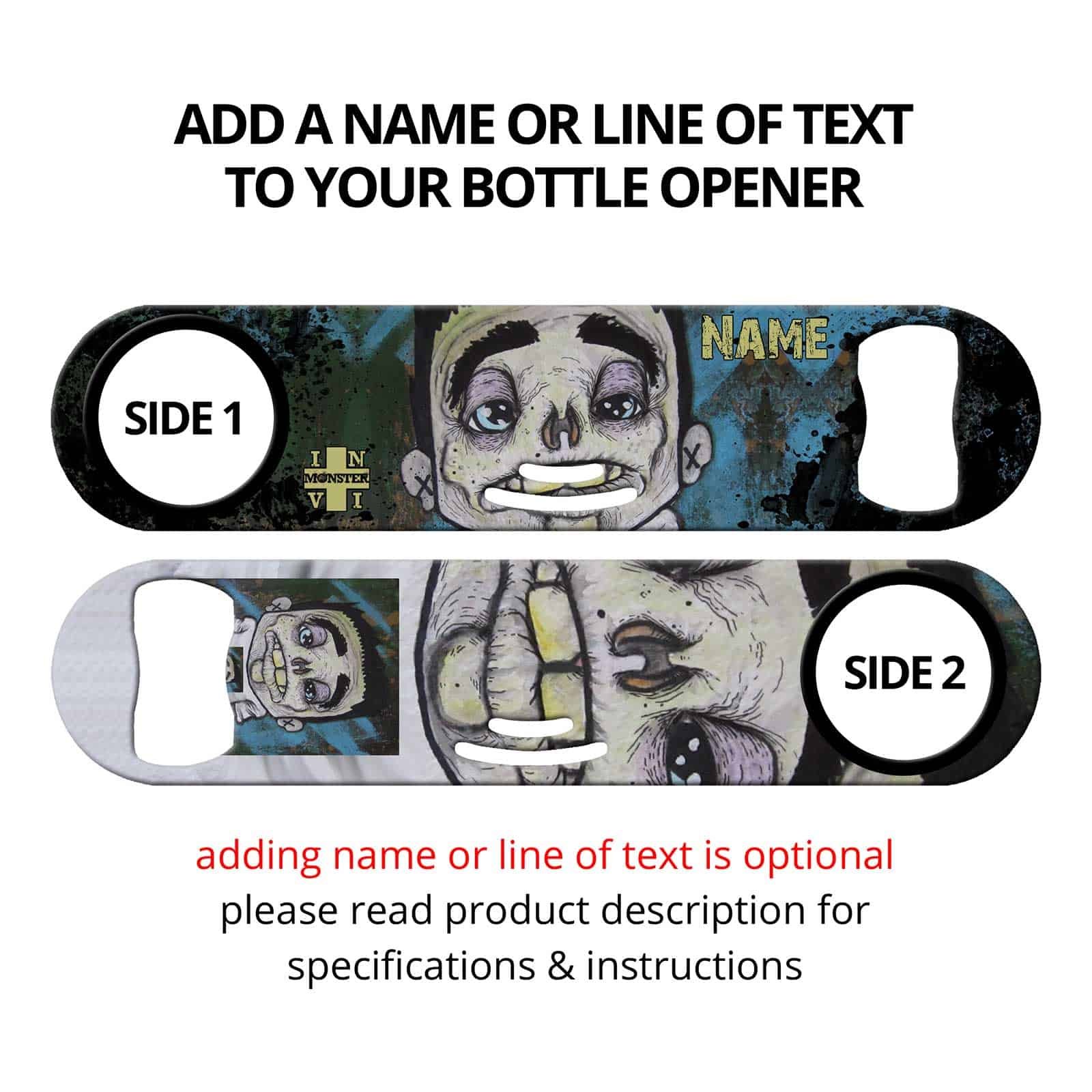 Bartender bottle opener featuring cute monster design. Commissioned art from INVI Monster. Exclusive to Ink Correct! Built-in cocktail strainer and can opener tip. No more broken nails! Unique bar tool for professional bartenders, as well as a great addition to your home bar! Personalize your speed opener by adding your name or line of text.