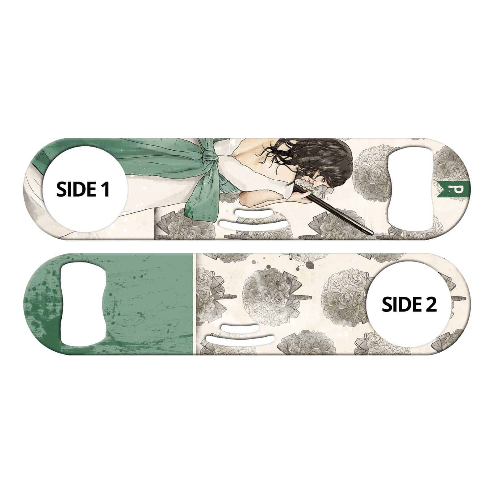 Bartender bottle opener featuring commissioned art by Keith P. Rein (The P is for Penis). Built-in cocktail strainer and can opener tip. Unique bar tool for professional bartenders, as well as a great addition to your home bar! Personalize your speed opener by adding your name or line of text.