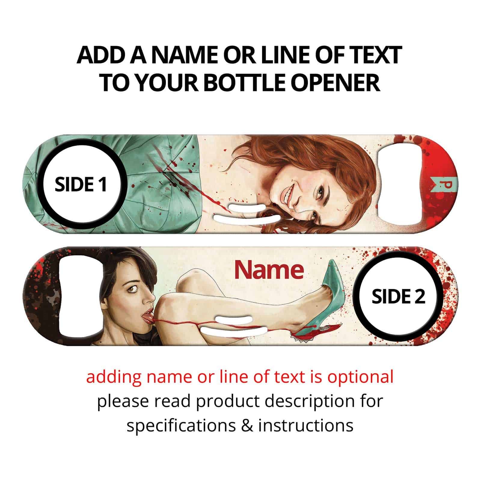 Bartender bottle opener featuring commissioned art by Keith P. Rein (The P is for Penis). Built-in cocktail strainer and can opener tip. Unique bar tool for professional bartenders, as well as a great addition to your home bar! Personalize your speed opener by adding your name or line of text.