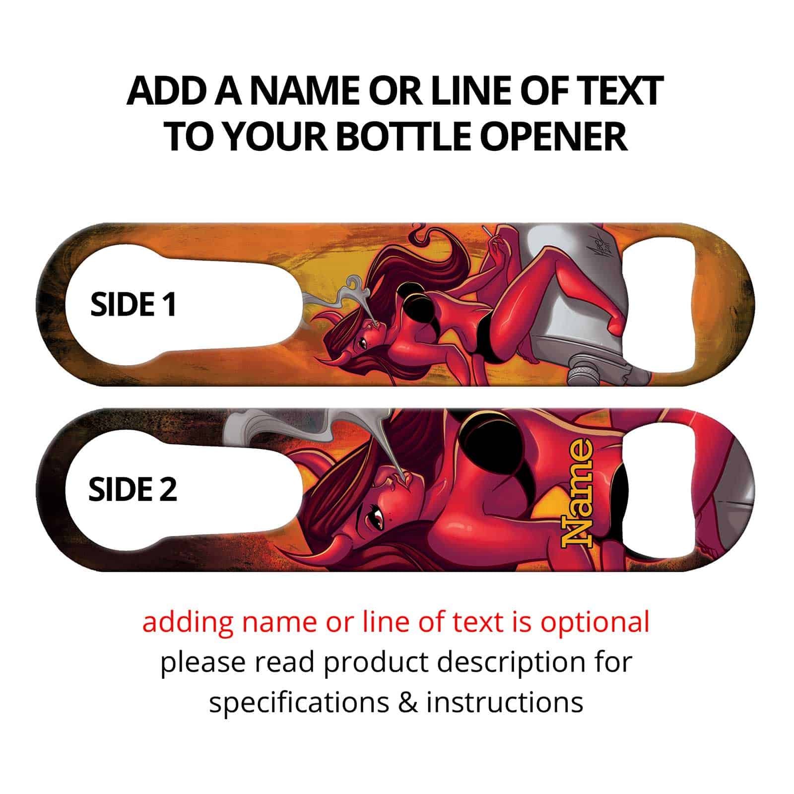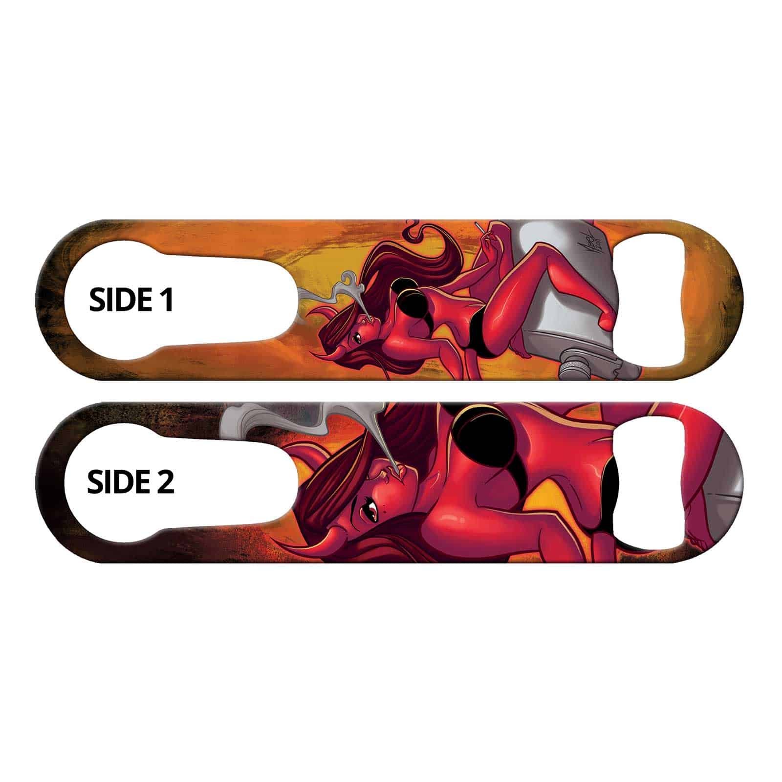 Bartender bottle opener featuring sexy devil girl. Commissioned art from world famous Martin Abel. Exclusive to Ink Correct! Convenient built-in pour spout remover. Unique bar tool for professional bartenders, as well as a great addition to your home bar! Personalize your speed opener by adding your name or line of text.