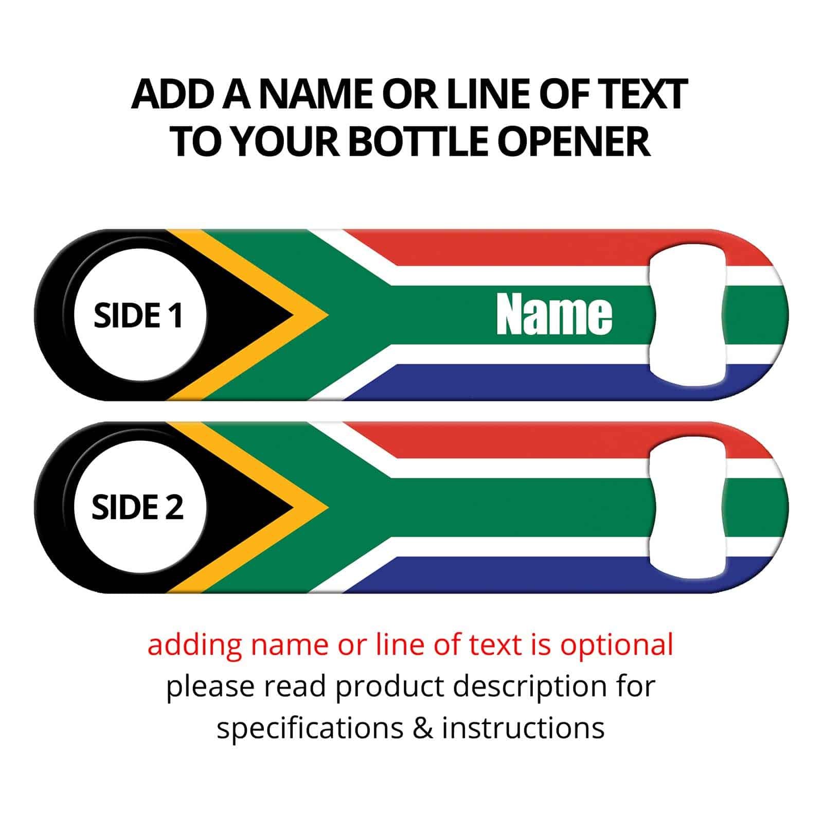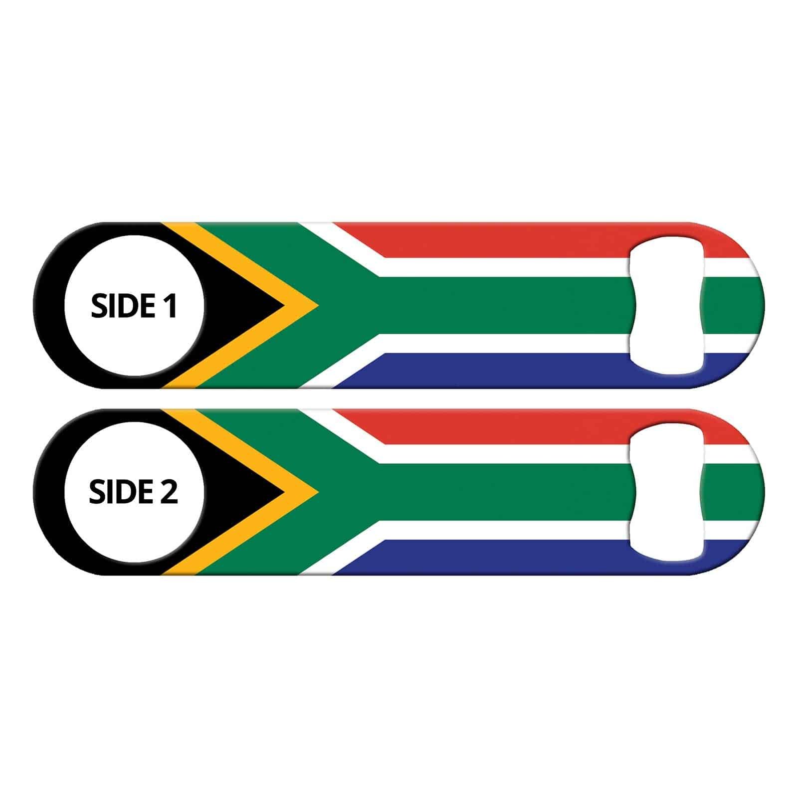 Bartender bottle opener featuring South African Flag. Show your pride!! Practical bar tool for professional bartenders, as well as a the home bar! Personalize your flat speed opener by adding your name or line or text. See all our Country Flags.