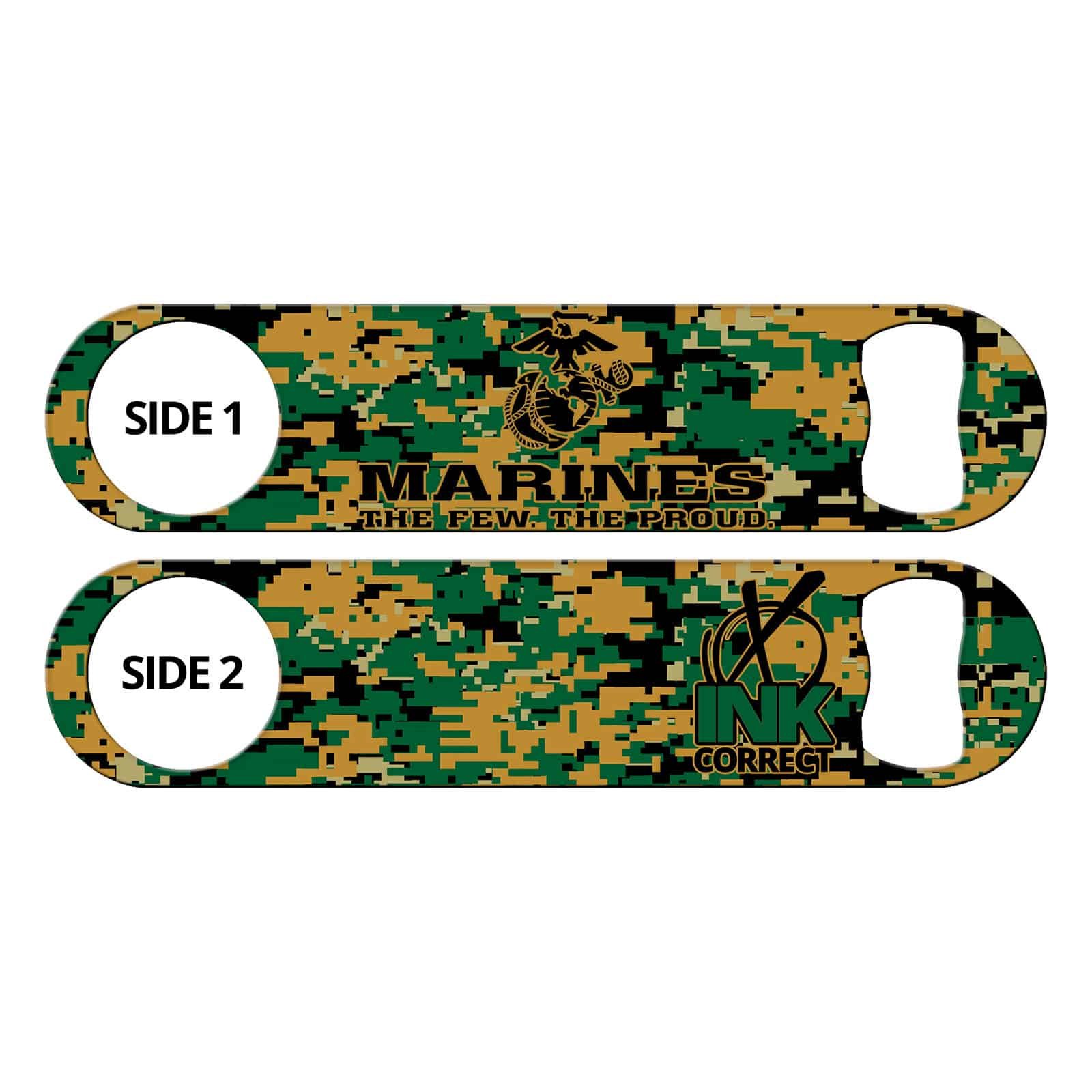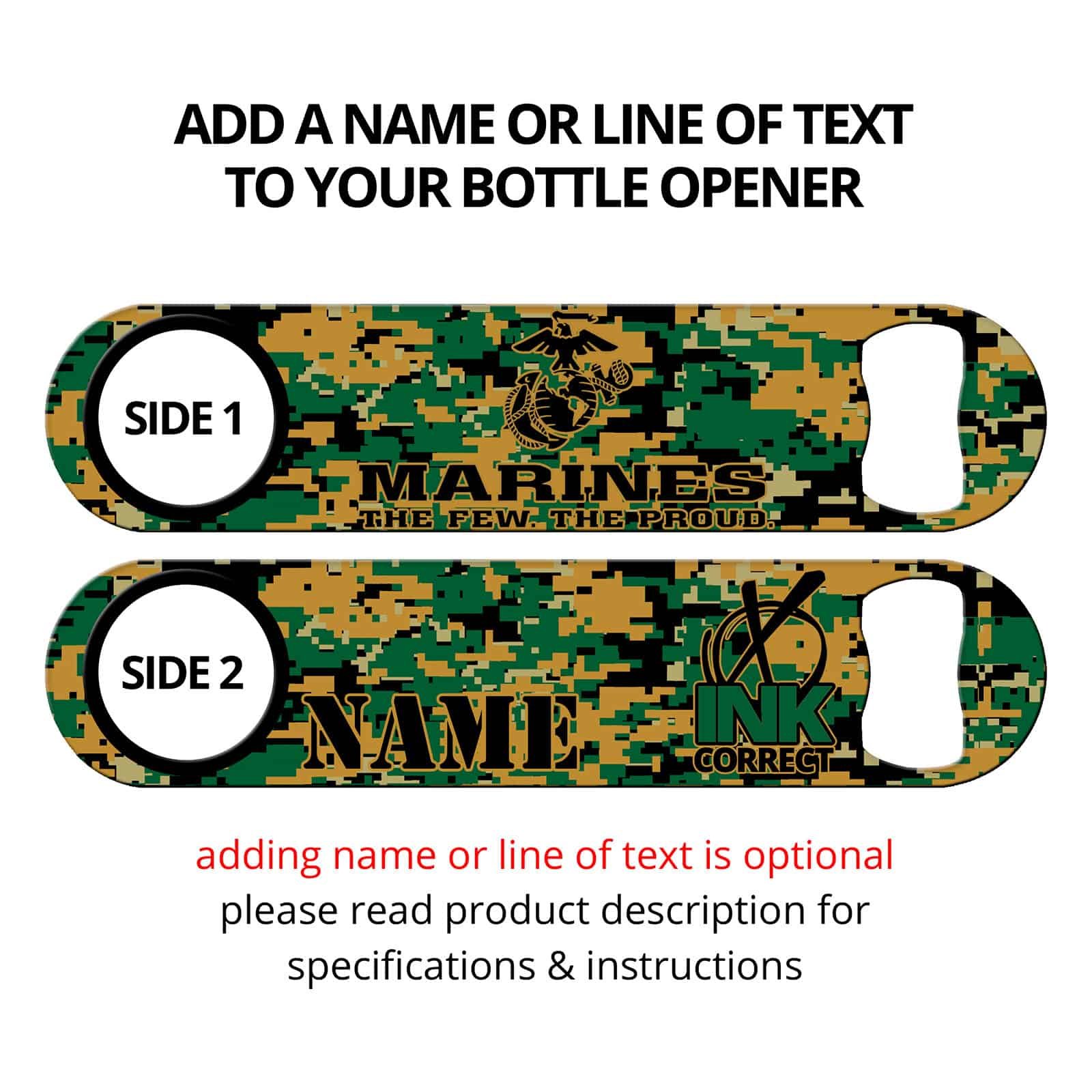Military bartender bottle opener featuring U.S. Marines emblem on digital camo background. Unique bar tool for professional bartenders, as well as a great addition to your home bar! Personalize your speed opener by adding your name or line of text.