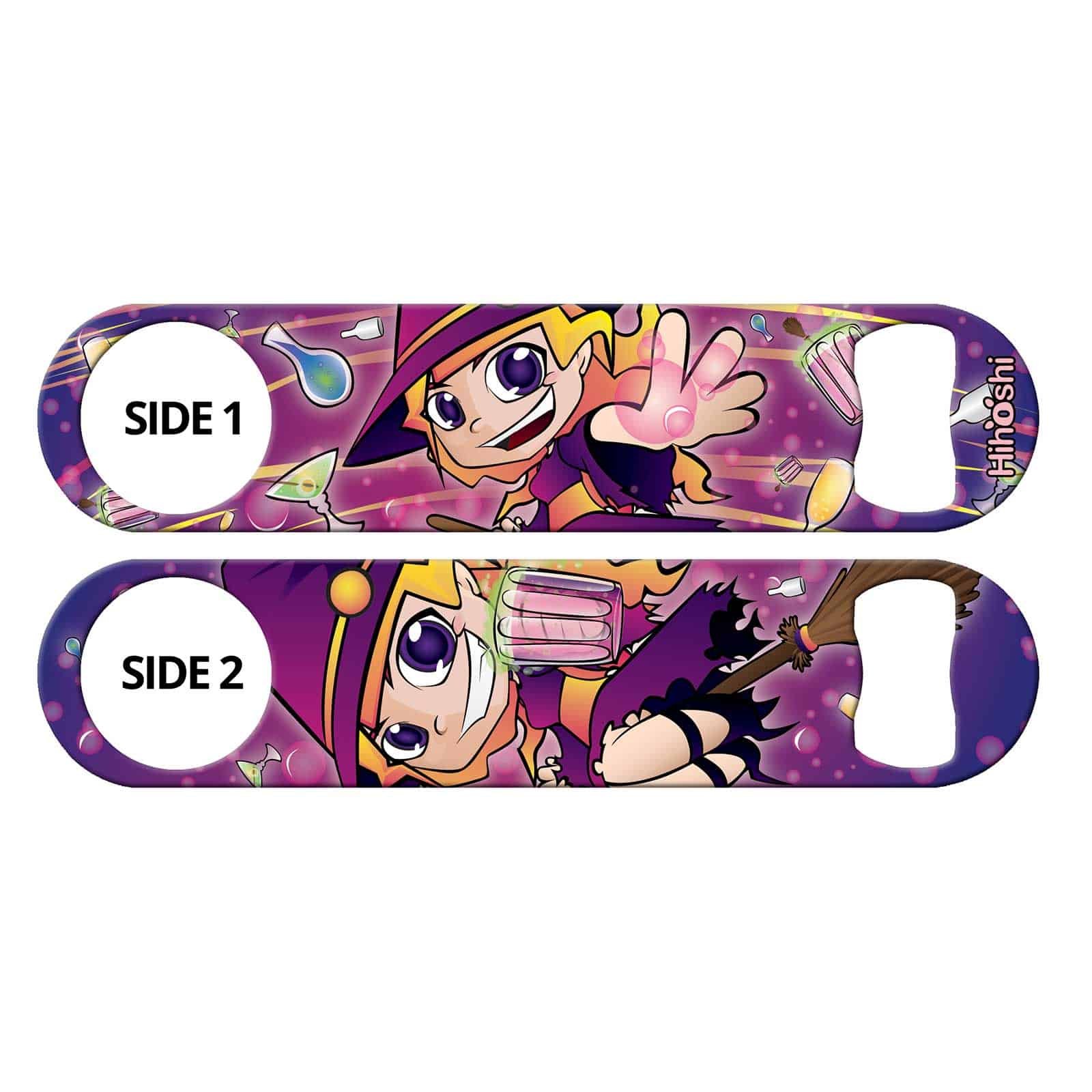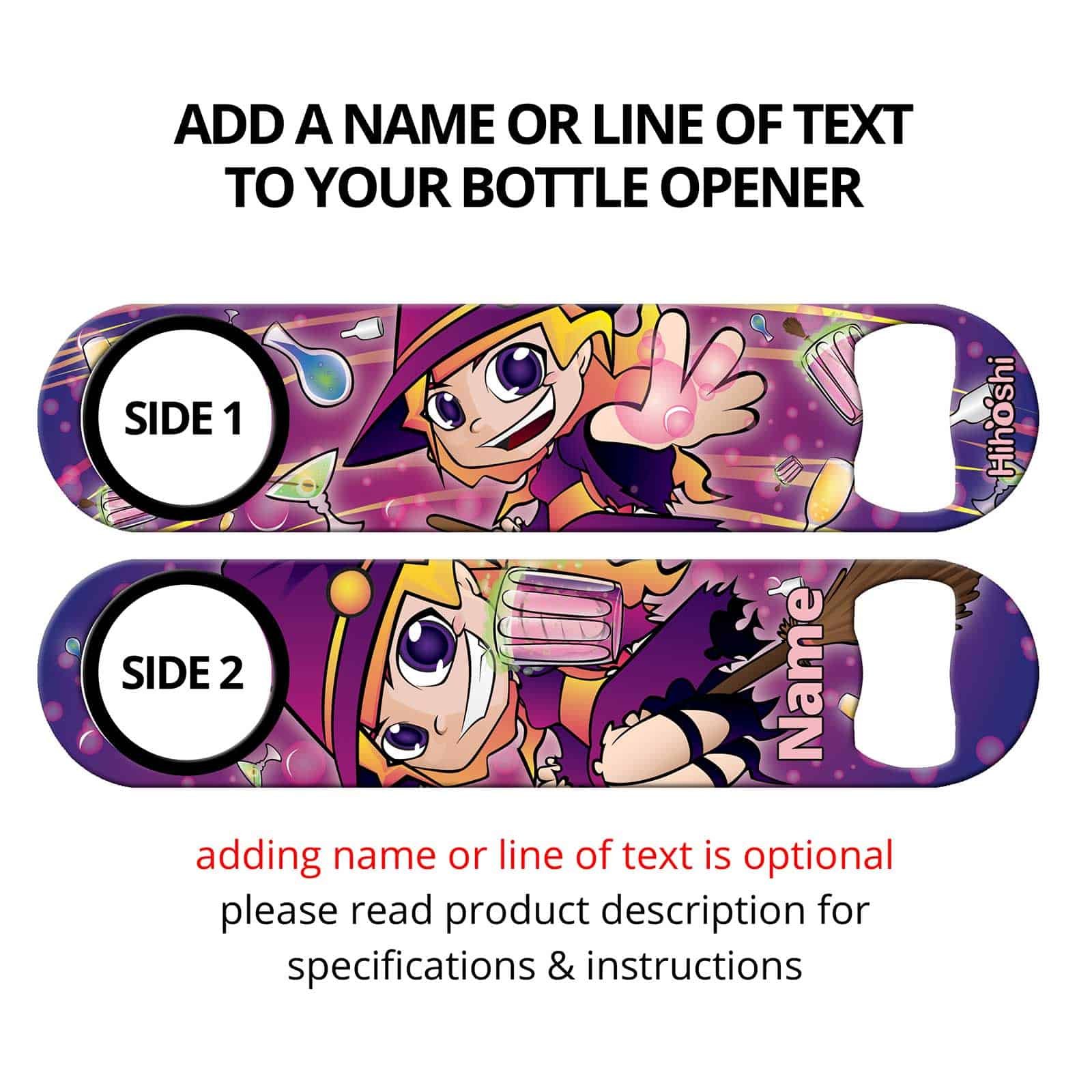 Bartender bottle opener featuring cute pop art design. Commissioned art from Hihoshi by Tiffany Cipper. Exclusive to Ink Correct! Unique bar tool for professional bartenders, as well as a great addition to your home bar! Personalize your speed opener by adding your name or line of text.